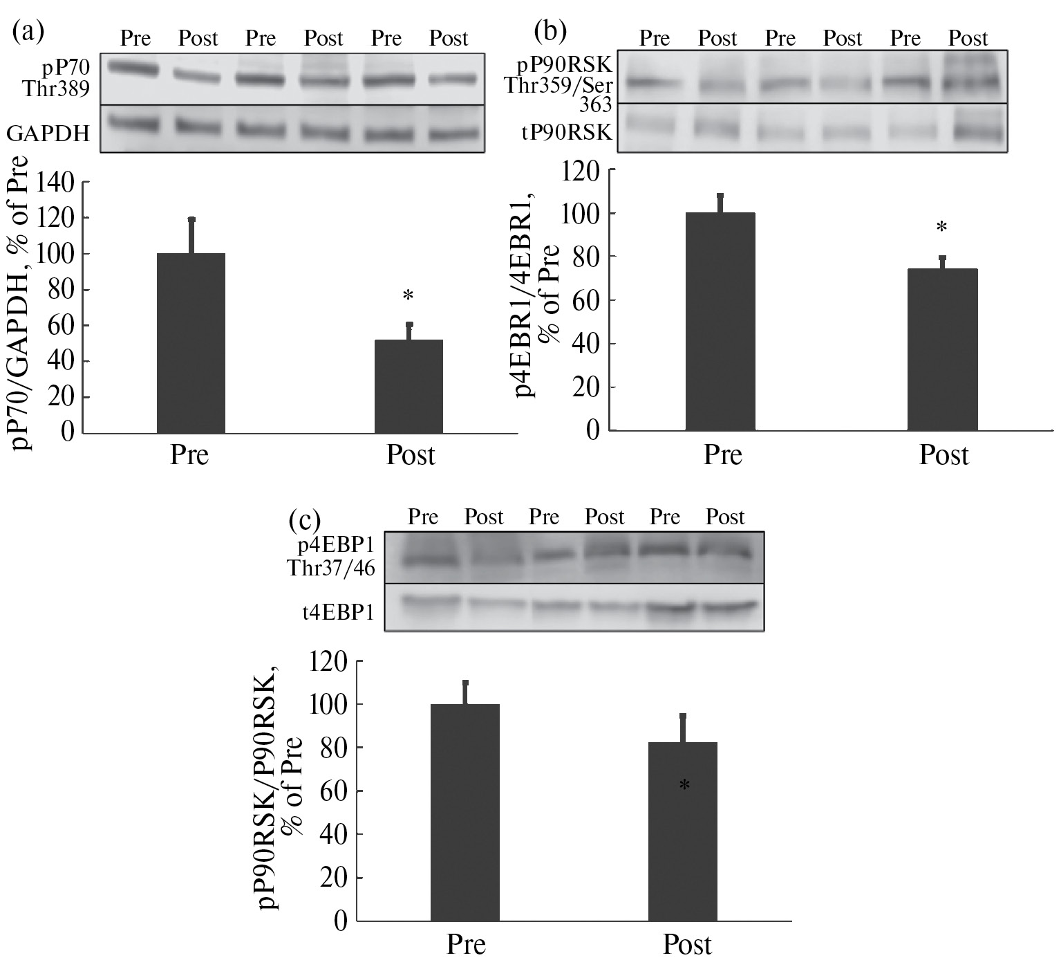 Рис. 1. Уровень фосфорилирования P70 (a), P90RSK (b) и 4EBP1 (c). Pre – до АНОГ, Post – после АНОГ. * – достоверное отличие от Pre.