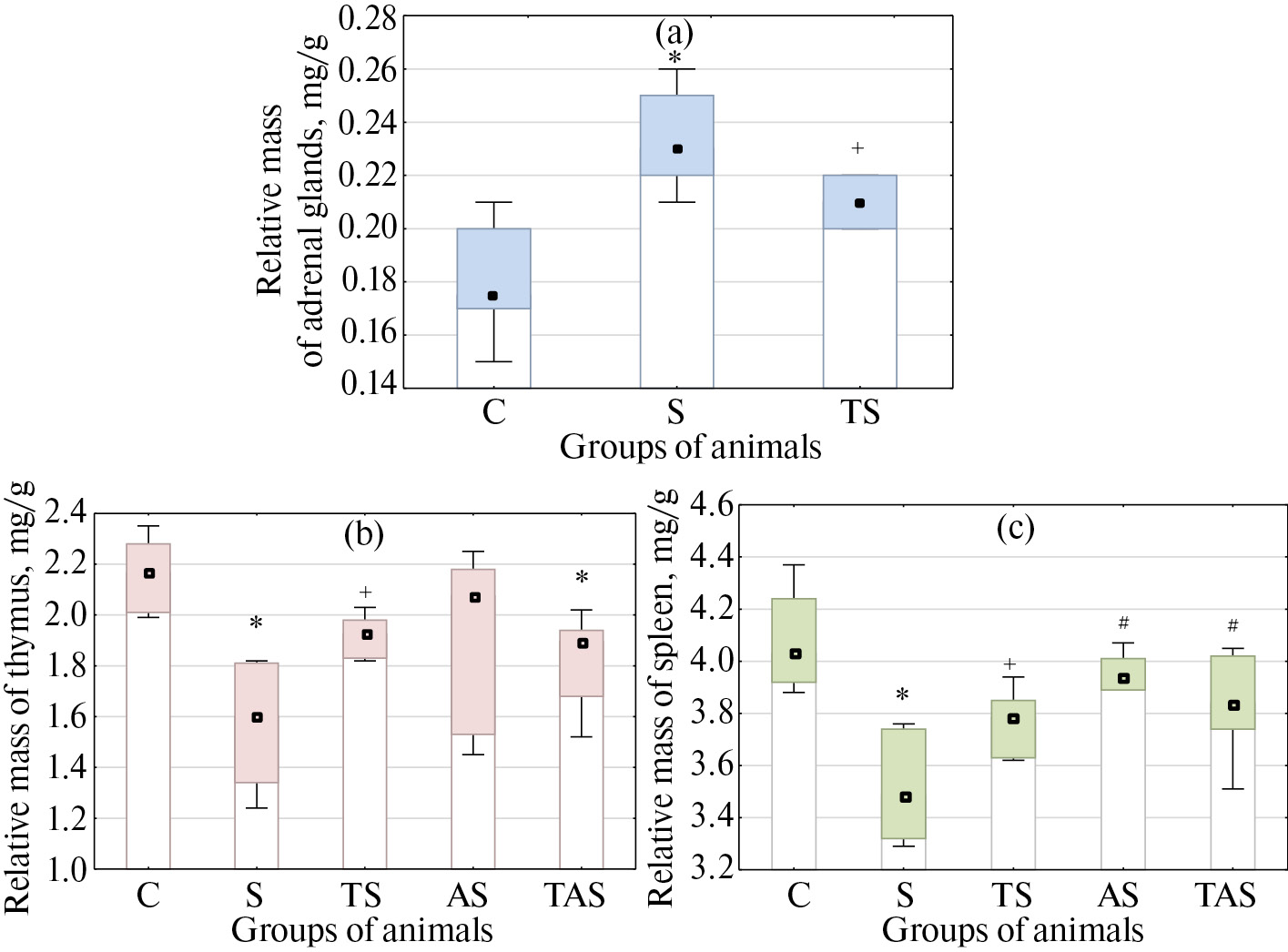 Рис. 2. Влияние введения малых доз L-тироксина на изменения относительной массы надпочечников (а), тимуса (b), селезенки (с) у крыс с интактными и удаленными надпочечниками без и после стресса.