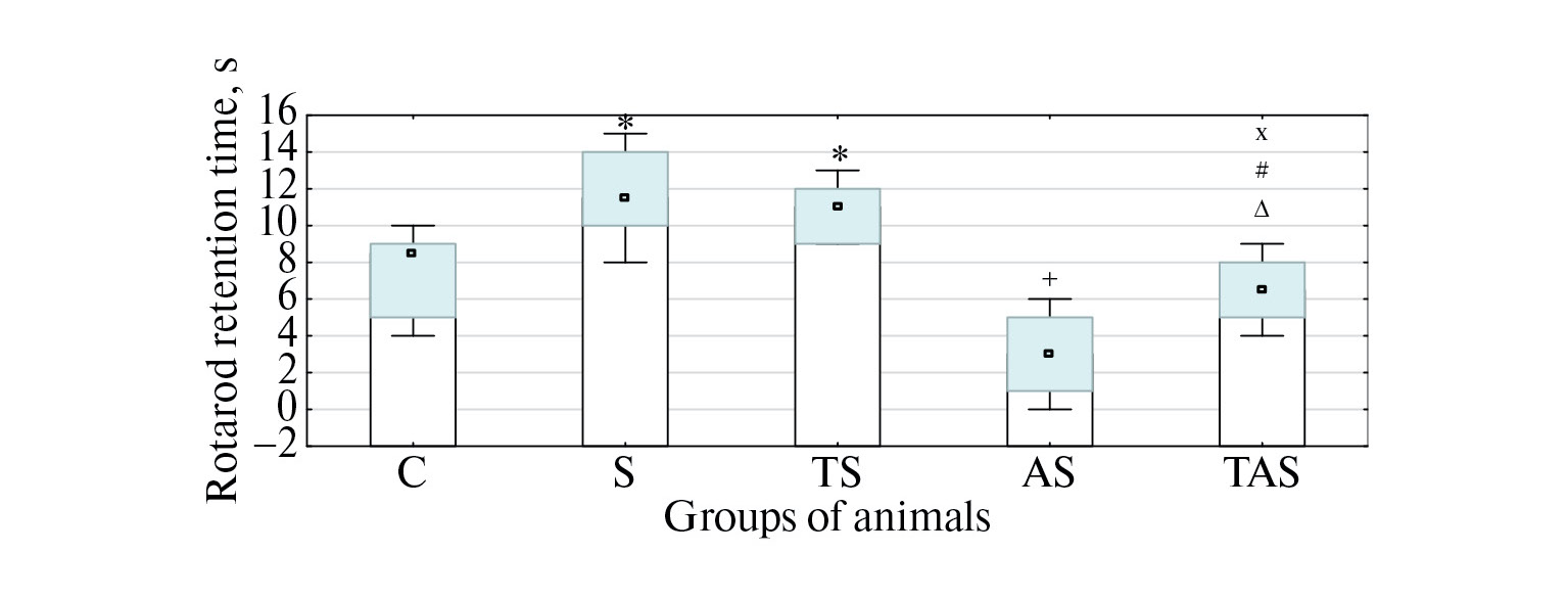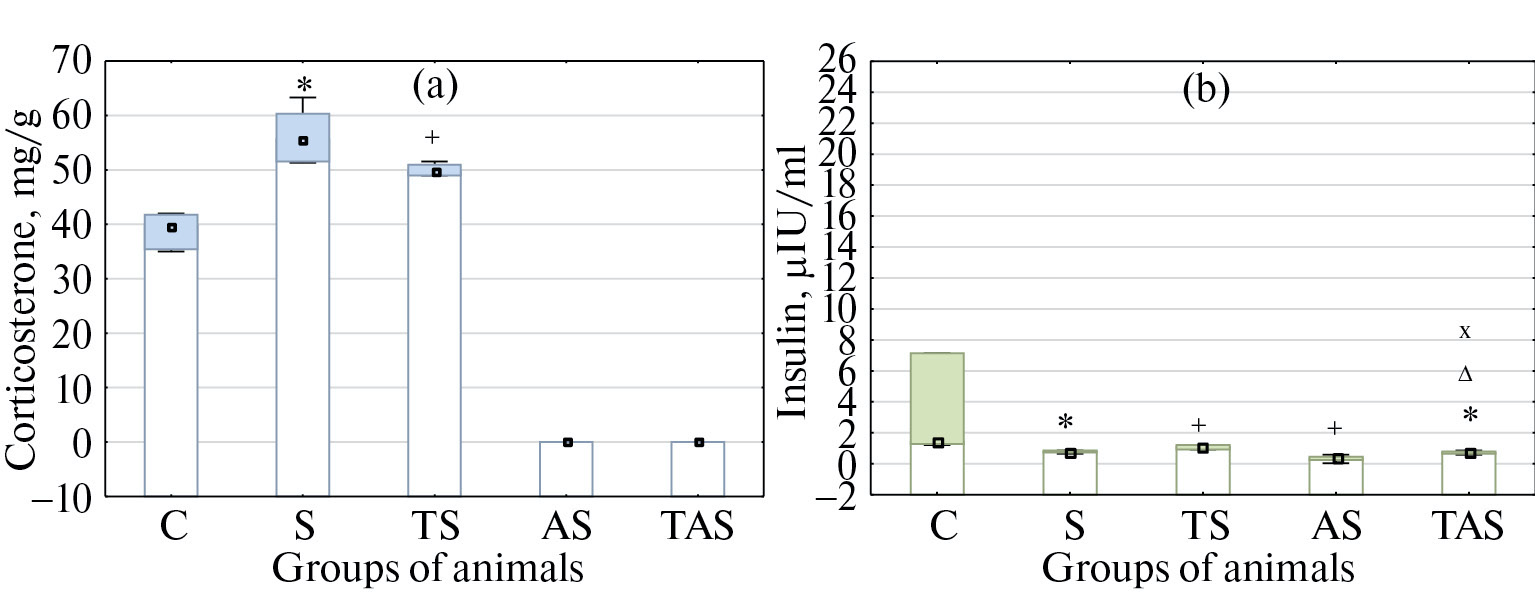 Интенсивность общего адаптационного синдрома исследовали по: 1) изменениям относительной массы надпочечников, тимуса, селезенки (определяли по отношению абсолютной массы органов к массе тела, которые измеряли на весах OHAUS Сorporation Adventurer Pro AV264 (Швейцария) и OHAUS Сorporation Adventurer AR5120 (Китай) соответственно); 2) сдвигам концентрации стресс-гормонов в крови (изучали методом иммуноферментного анализа) – кортикостерона («Rat corticosterone», Bioassay Technology Laboratory, China) и инсулина («Инсулин», ООО «Хема», Россия); 3) состоянию слизистой оболочки желудка, оцениваемому в отраженном свете под малым увеличением лупы (×5) (за 24 ч до эксперимента животных лишали пищи, сохраняя свободный доступ к воде). Желудок вскрывали вдоль большой кривизны и промывали 0.9%-ным раствором NaCl. Определяли частоту поражения (отношениe числа животных, имевших кровоизлияния в слизистой, к общему количеству крыс в группе, выраженное в %); тяжесть (в баллах: 0 – отсутствие кровоизлияний; 0.5 – гиперемия; 1 – единичные (1 или 2) точечные кровоизлияния; 2 – множественные (более 3), незначительные (площадью около 1 мм2) кровоизлияния; 3 – множественные, значительные (площадью более 1 мм2) кровоизлияния; 4 – массивные кровоизлияния, охватывающие практически всю поверхность слизистой; индекс поражения (произведение частоты и средней тяжести поражения (общее число баллов в группе, деленное на количество животных в ней) в группе, деленное на 100) [13]; 4) изменениям двигательной и исследовательской активности крыс, уровня их тревожности (оценивали в тесте «открытое поле» с использованием программного обеспечения SMART 3.0) и физической выносливости (изучали с помощью ротарода LE8300 после 3-дневной адаптации).