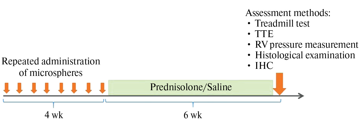 Через 6 недель после последнего введения микросфер выполнялись следующие исследования: тредмил-тест, эхокардиографическое исследование (ЭХО-КГ), измерение систолического давления в ПЖ (СДПЖ) путем катетеризации, гистологические исследования легких (рис. 1).