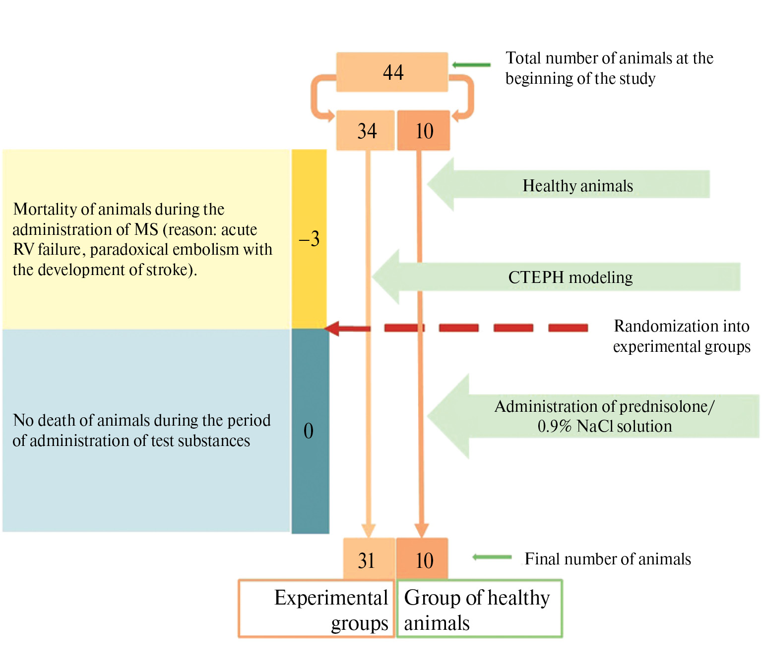 Рис. 2. Схема потерь экспериментальных животных в основной серии. CTEPH – хроническая тромбоэмболическая легочная гипертензия, MS – микросферы, RV – правый желудочек, Saline – физиологический раствор.