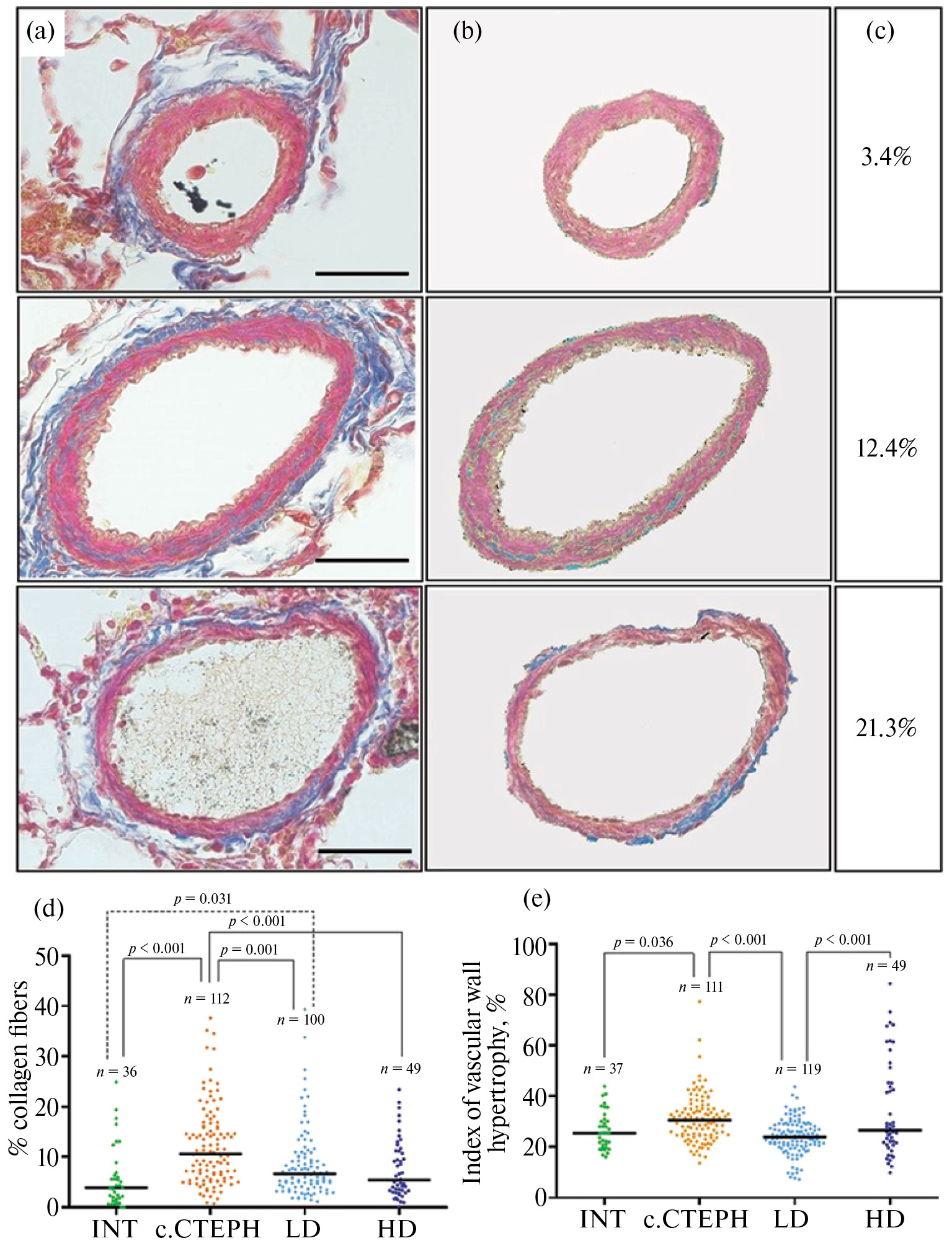 Рис. 5. Результаты гистологического исследования. (a – b) – репрезентативные микрофотографии сосудов: (a) – окрашивание по методу Пикро – Маллори; (b) – выбор границ сосудов с помощью ImageJ (Wayne Rasband, США); (c) – номинальный процент фиброза сосудистой стенки на репрезентативных микрофотографиях; (d) – процент коллагеновых волокон в структуре сосудистой стенки ветвей легочной артерии в исследуемых группах; (e) – индекс гипертрофии сосудистой стенки. Одно деление = 100 мкм. INT – группа здоровых животных, c.CTEPH – группа контрольной хронической тромбоэмболической легочной гипертензии, LD – низкая доза преднизолона, HD – высокая доза преднизолона.