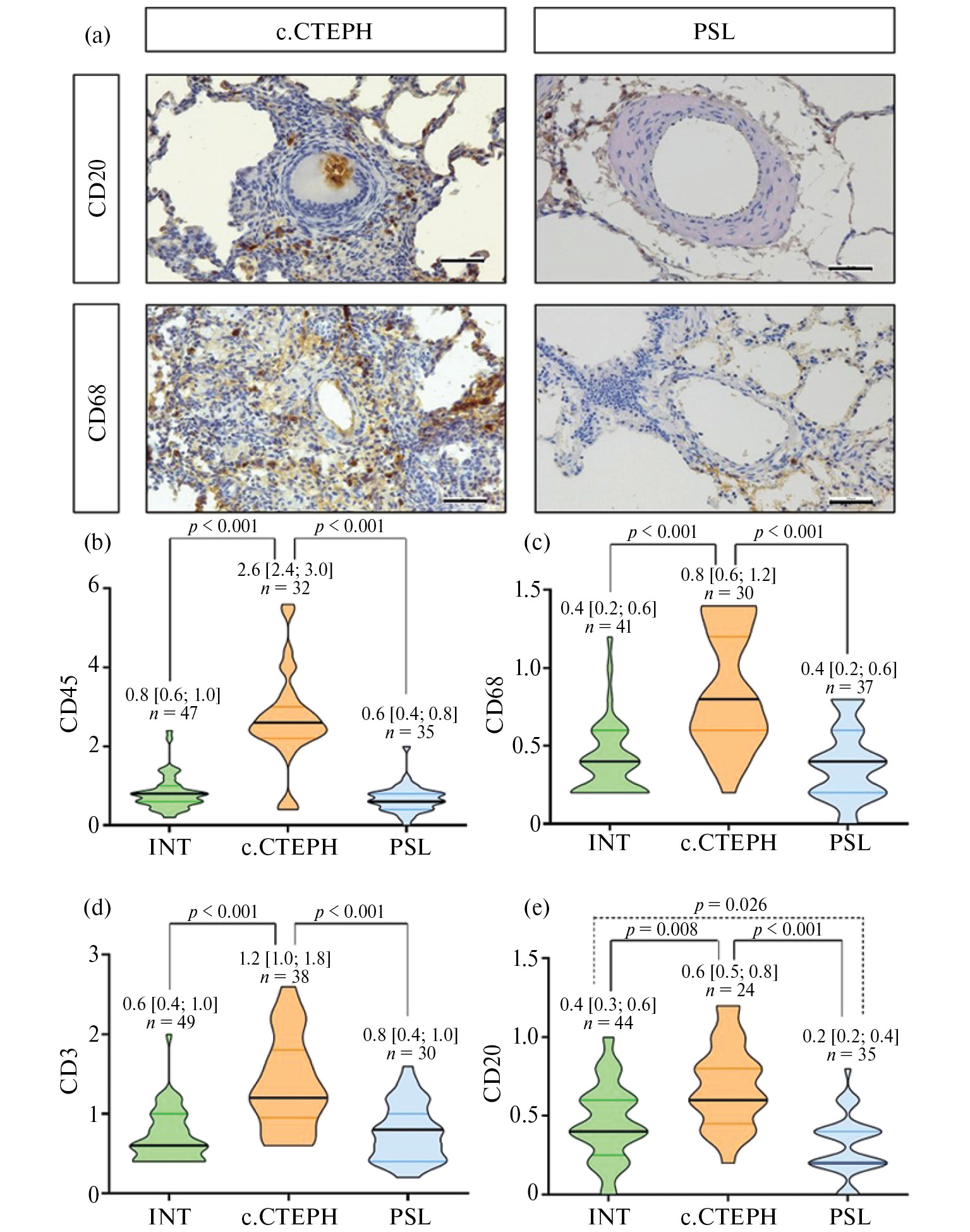 Рис. 6. Результаты иммуногистохимического исследования для оценки воспалительной инфильтрации сосудистой стенки и перифокальной области. (a) – репрезентативные микрофотографии иммуногистохимических препаратов в группах к.ХТЭЛГ и ГКС: верхний ряд – окрашивание на СD20 (В-лимфоциты), нижний ряд – окрашивание на СD68 (моноциты / макрофаги). Позитивные клетки маркированы ярким коричневым окрашиванием мембран. (b – e) – среднее количество позитивных клеток в анализируемых ячейках для каждого сосуда. (b) – СD45 (общелейкоцитарный антиген); (c) – СD68 (моноциты / макрофаги), (d) – СD3 (Т-лимфоциты); (e) – СD20 (В-лимфоциты). Одно деление = 50 мкм. Int – группа здоровых животных, c.CTEPH – группа контрольной хронической тромбоэмболической легочной гипертензии, PSL – группа применения низкой дозы преднизолона.