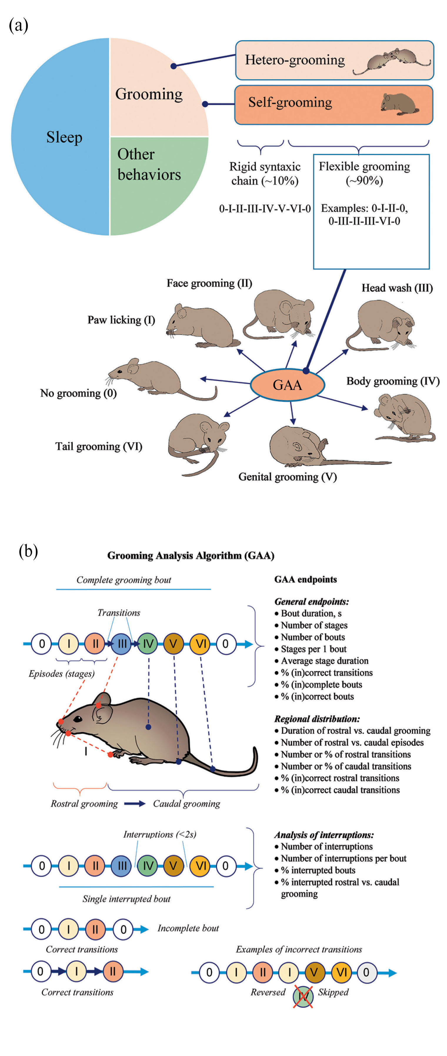Рис. 1 (a). Груминг лабораторных грызунов (a) и методы оценки его микроструктуры (b) c использованием Алгоритма анализа груминга [6–9] (ААГ/GAA, см. табл. 1 и текст далее). Каждое отдельное событие ауто-груминга является актом (bout), состоящим из отдельных стадий (эпизодов, episodes/stages) груминга (табл. 2). Первые три стадии направлены на переднюю часть тела и относятся к ростральному грумингу, остальные относят к каудальному грумингу. Переходы от одной стадии к другой называются переходами и оцениваются как правильные (в ростро-каудальном направлении 0-I-…-VI-0) или неправильные, с нарушением направленности – например, реверсии, пропуски стадий. Акты груминга могут быть полными (вся последовательность) или неполными – например, абортивными (прерванными ранее, чем стадия VI) либо неправильно начавшимися с более поздних стадий. Прерывания менее 2 с считаются как остановки внутри акта груминга, и число таких остановок груминга, а также % актов с остановками учитывается при анализе поведения. Примеры методов визуализации микроструктуры груминга в нейробиологических исследованиях представлены на рис. 2.