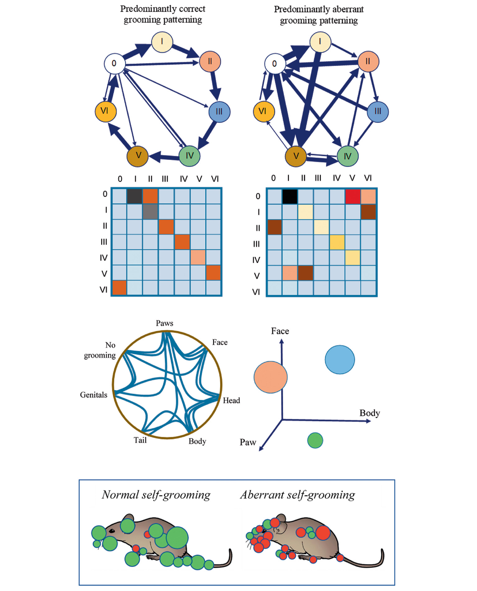 Оценка микроструктуры груминга важна при исследовании заболеваний ЦНС, например, обсессивно-компульсивного расстройства (ОКР) и аутизма. Так, при хроническом применении кокаина появляются стереотипии и подобные ОКР эффекты [22], например, повторяются короткие последовательности груминга, что указывает на стрессорную природу наблюдаемого поведения и на вероятную роль α7-субъединицы никотинового рецептора ацетилхолина (нАХР) в модуляции ОКР-подобного эффекта кокаина. Повышенный груминг с чрезмерно повторяющимися паттернами часто встречается в животных моделях расстройств тревожного спектра и ОКР. Возможной причиной такого поведения является повышенная передача сигналов метаботропного глутаматного рецептора 5 (mGluR5), которая приводит к нарушению поведения и активности стриатума [31]. Нарушения могут возникнуть и в биохимических процессах. Например, дефицит Zfp462, белка цинковых пальцев, специфичного для позвоночных, вызывает у мышей тревожное поведение с чрезмерным грумингом [32] – повышением числа актов груминга и процента прерванных актов. Мыши с экспериментальным аутоиммунным энцефаломиелитом проявляют чрезмерный груминг с характерными паттернами, присущими ОКР – их груминг носит ригидный характер с повышенным количеством стереотипно повторяющихся действий [33].