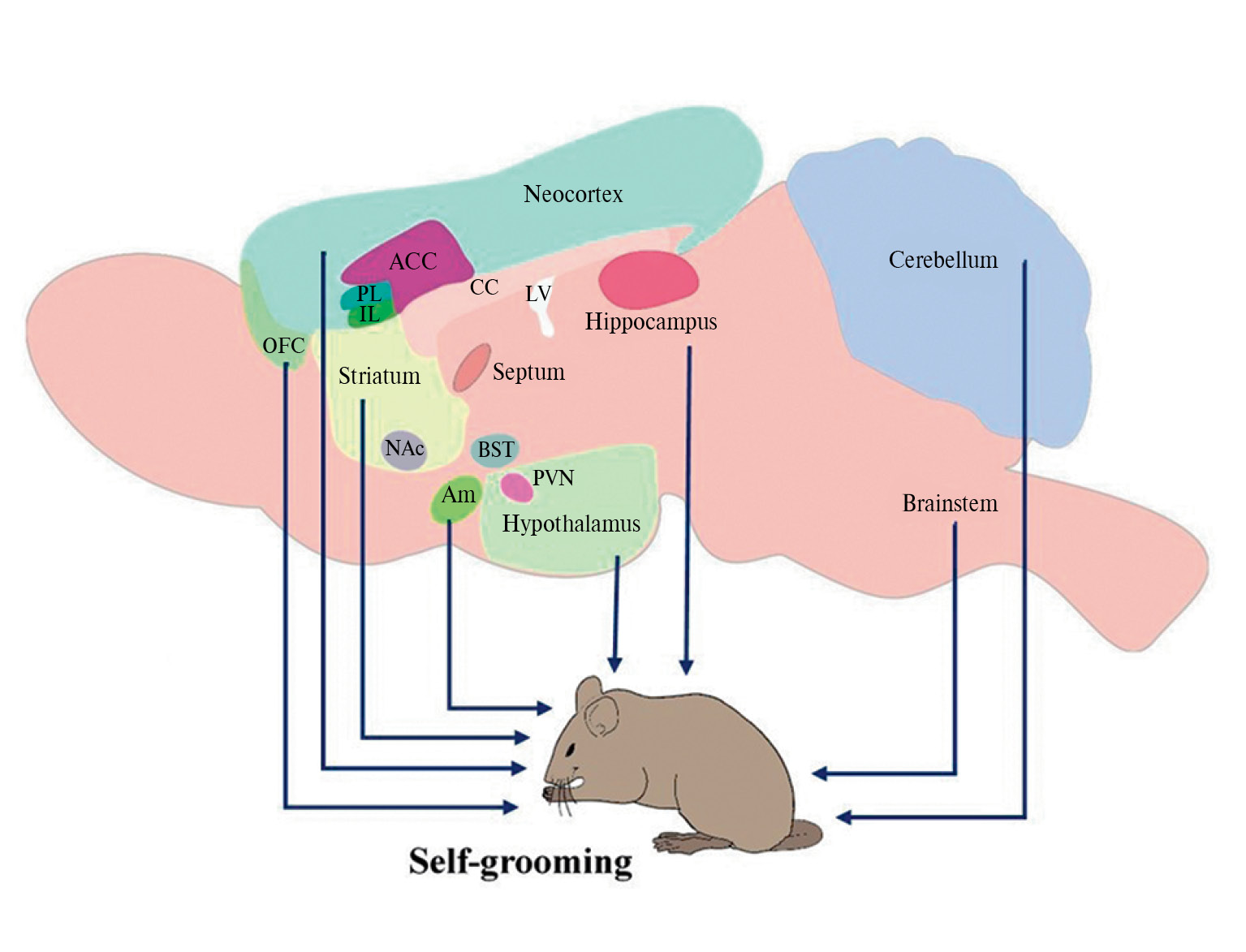 Из основных зон мозга, ответственных за груминг, особо важную роль играют кора головного мозга, базальные ганглии, гипоталамус, миндалина, мозжечок, и продолговатый мозг [1] (рис. 3, табл. 4). Груминг грызунов и его организация зависят от базальных ганглиев, в частности, от связи дофаминовых нейронов [45]. Кора головного мозга, таламус и миндалевидное тело регулируют груминг, посылая и получая сигналы в стриатум. Мозжечок координирует и настраивает движения груминга, имея проекции в разные части головного и спинного мозга. Миндалевидное тело влияет на груминг в зависимости от контекста (например, при стрессе или в рамках социальной активности).