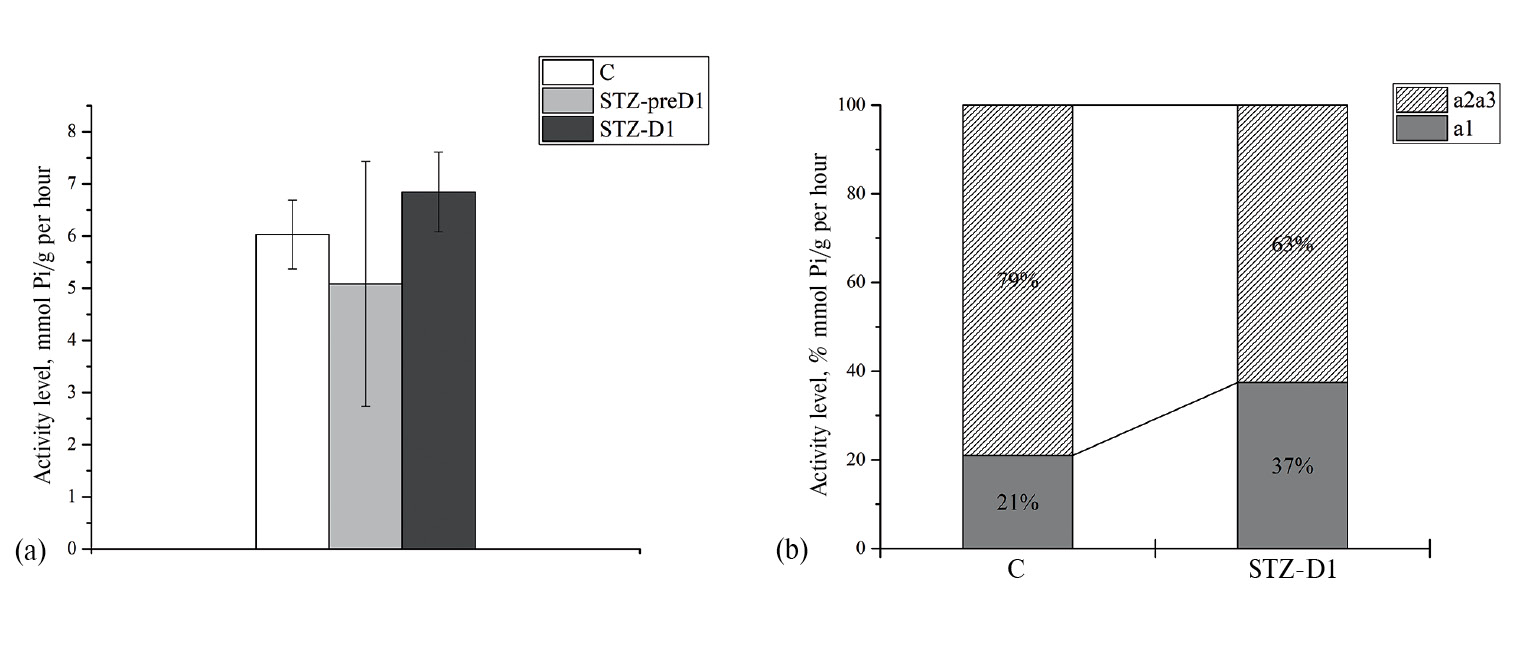 Рис. 1. Уровень активности Na+/K+-АТФазы в левом желудочке в группах контрольной (C, n = 5), STZ-preD1 (n = 3) и STZ-D1 (n = 8). (a) – aктивность чувствительной к уабаину (1 мМ) Mg2+–зависимой Na+/K+-АТФазы. Данные представлены как M ± SEM. (b) – активность высокочувствительной к уабаину (100 нМ) Na+/K+-АТФазы. Данные представлены как % от общей активности Na+/K+-АТФаза.