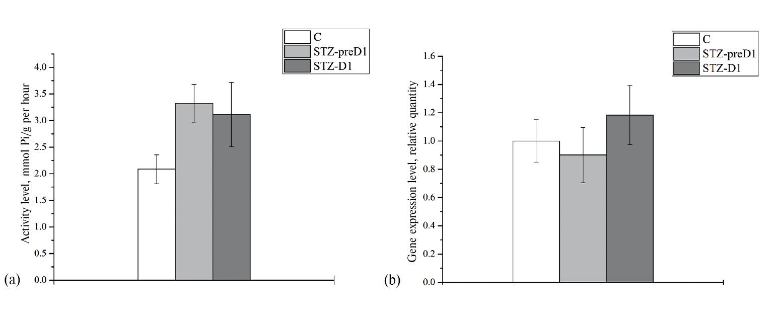 Уровень фракций высокочувствительной к уабаину Na+/K+-АТФаза (α2-, α3-изоформы) в группах С и STZ-D1, обнаруженный нами в данном исследовании, превышает пределы этой фракции, описанные в работах [1, 32, 35, 39], но, тем не менее, соответствует литературным данным [1, 36, 39], где описано, что при развитии СД1 пропорции α1/α2 изоформ существенно не меняются. В одной работе описано, что при 6-недельном STZ-D1 снижается количество высокоаффинных к уабаину связывающих мест (α2-, α3-изоформы), но не низкоаффинных (α1-изоформа) [37].