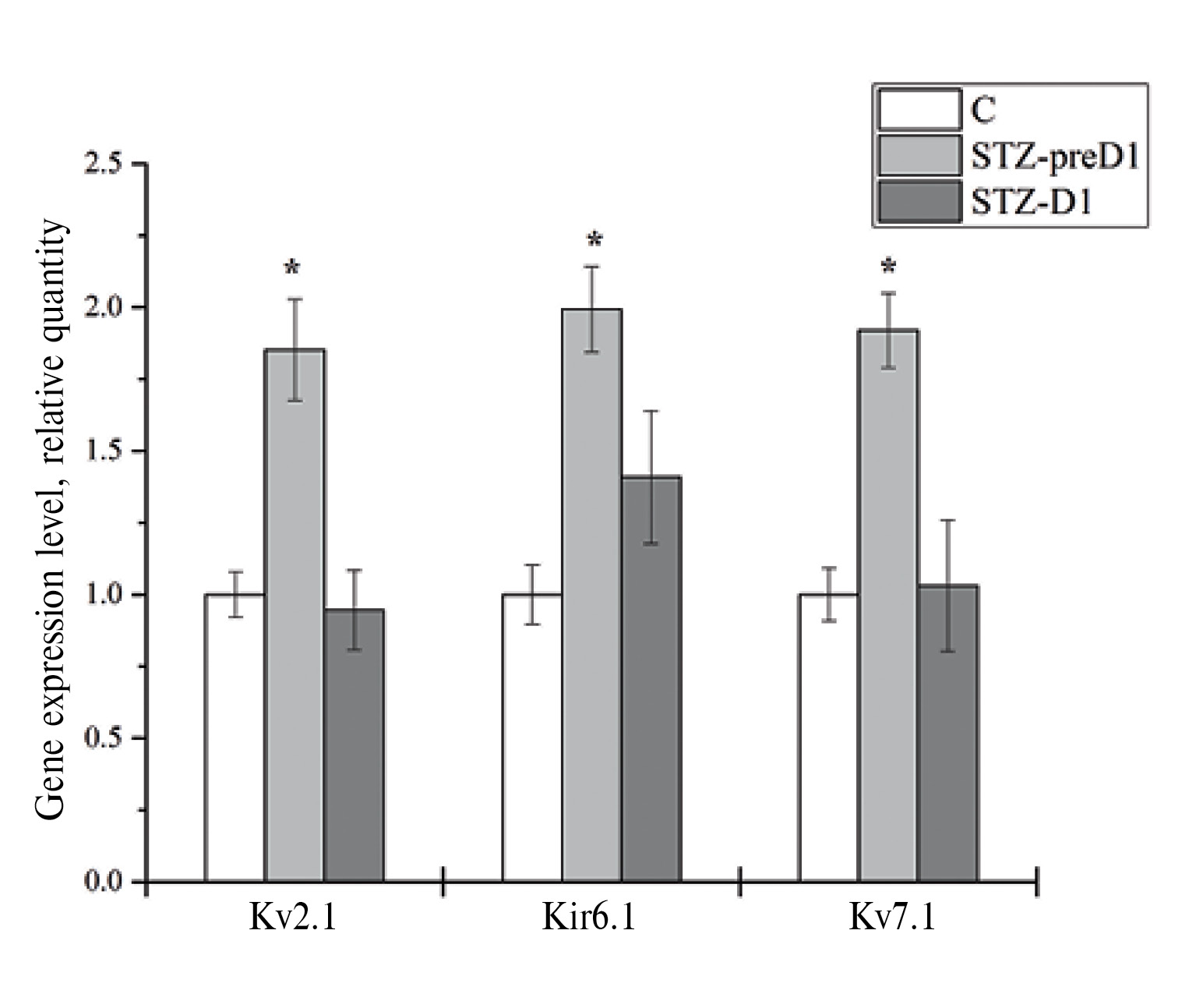 Рис. 4. Уровень экспрессии генов подтипов калиевых каналов Kv2.1, Kir6.1 и Kv7.1 в левом желудочке в группах С (n = 5), STZ-preD1 (n = 8) и STZ-D1 (n = 8). Данные представлены как M ± SEM. Статистически значимые отличия при p < 0.05: * – группа STZ-preD1 от С. Референсный ген – 18S/45S рибосомальная РНК.