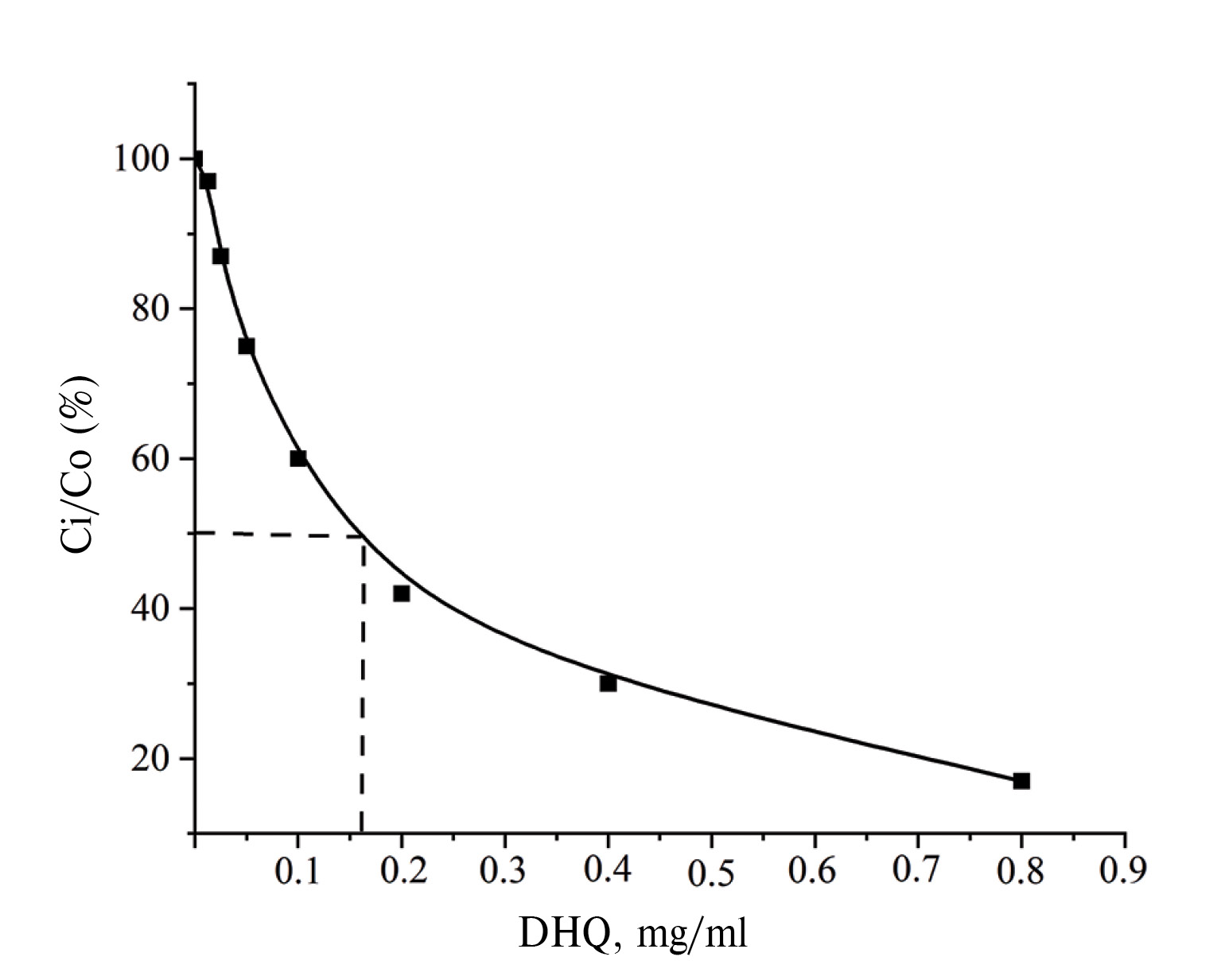 Рис. 2. Кинетическая кривая зависимости Сi/Сo (%) от концентрации ДГК (Сi – концентрация карбонильных групп при данной концентрации ДГК, Сo – это концентрация карбонильных групп в среде без ДГК). Пунктиром показана концентрация ДГК, вызывающая 50%-ное подавление (IС50) интенсивности ОМБ при инкубации изолированных митохондрий в среде Фентона.