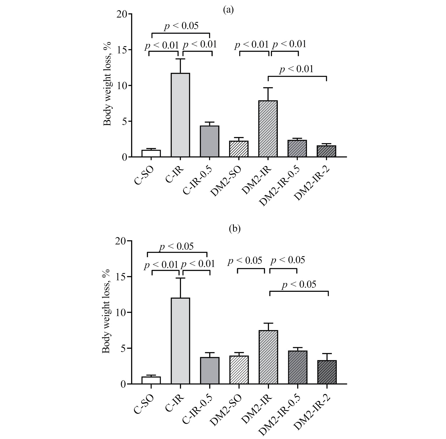Рис. 1. Потеря массы тела у крыс с СД2 и без него, перенесших двухсосудистую ишемию и реперфузию, через 3 (a) и 7 (b) суток после начала реперфузии и влияние на нее интраназально вводимого инсулина. Представлена потеря массы тела в% от общей массы тела на 3-и (a) и 7-е (b) сутки реперфузии. Обозначение групп: C-SO – ложнооперированные крысы без СД2; C–IR – крысы без СД2, перенесшие двухсосудистую ишемию переднего мозга и реперфузию; C–IR-0.5 – крысы без СД2, перенесшие двухсосудистую ишемию переднего мозга и реперфузию и получавшие ИВИ в дозе 0.5 МЕ/крыса/сутки; DM2-SO – ложнооперированные крысы с СД2; DM2-IR – крысы c СД2, перенесшие двухсосудистую ишемию переднего мозга и реперфузию; DM2-IR-0.5 – крысы c СД2, перенесшие двухсосудистую ишемию переднего мозга и реперфузию и получавшие ИВИ в дозе 0.5 МЕ/крыса/сутки; DM2-IR-2 – крысы c СД2, перенесшие двухсосудистую ишемию переднего мозга и реперфузию и получавшие ИВИ в дозе 2 МЕ/крыса/сутки. Данные представлены в виде M ± SEM (n = 6 во всех группах).