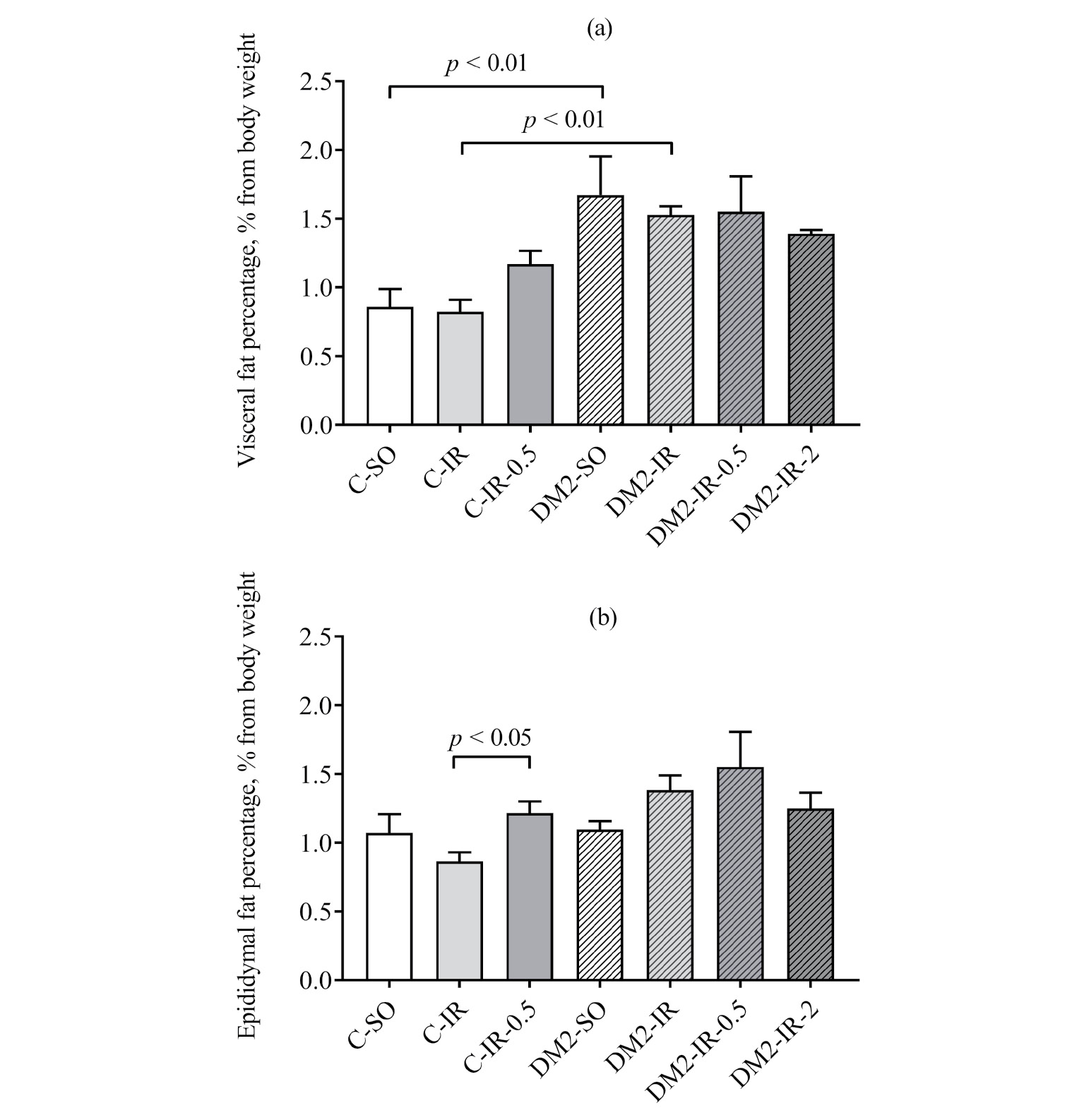 Рис. 2. Доля висцерального (a) и эпидидимального (b) жира у крыс, перенесших ишемию переднего мозга и 7-дневную реперфузию, с СД2 и без него, и влияние на них интраназально вводимого инсулина. Представлена доля жировой ткани в % от общей массы тела. Обозначение групп: C-SO – ложнооперированные крысы без СД2; C–IR – крысы без СД2, перенесшие двухсосудистую ишемию переднего мозга и реперфузию; C–IR-0.5 – крысы без СД2, перенесшие двухсосудистую ишемию переднего мозга и реперфузию и получавшие ИВИ в дозе 0.5 МЕ/крыса/сутки; DM2-SO – ложнооперированные крысы с СД2; DM2-IR – крысы c СД2, перенесшие двухсосудистую ишемию переднего мозга и реперфузию; DM2-IR-0.5 – крысы c СД2, перенесшие двухсосудистую ишемию переднего мозга и реперфузию и получавшие ИВИ в дозе 0.5 МЕ/крыса/сутки; DM2-IR-2 – крысы c СД2, перенесшие двухсосудистую ишемию переднего мозга и реперфузию и получавшие ИВИ в дозе 2 МЕ/крыса/сутки. Данные представлены в виде M ± SEM (n = 6 во всех группах).
