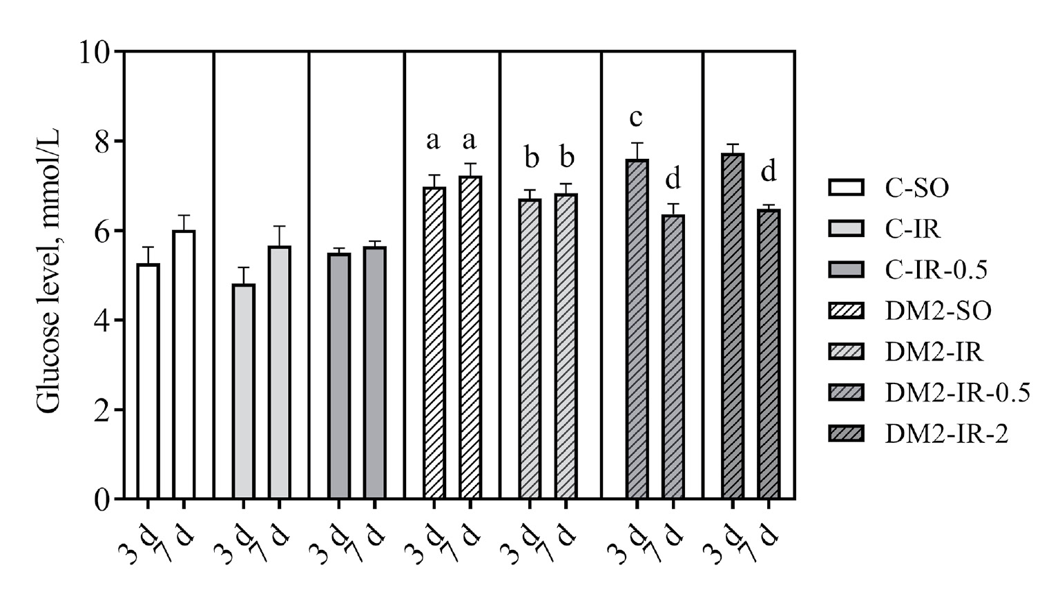 Рис. 3. Уровни постпрандиальной глюкозы в крови крыс с СД2 и без него, перенесшие ишемию переднего мозга и реперфузию, и влияние на них интраназально вводимого инсулина на 3-й и 7-й дни реперфузии. Обозначение групп: C-SO – ложнооперированные крысы без СД2; C–IR – крысы без СД2, перенесшие двухсосудистую ишемию переднего мозга и реперфузию; C–IR-0.5 – крысы без СД2, перенесшие двухсосудистую ишемию переднего мозга и реперфузию и получавшие ИВИ в дозе 0.5 МЕ/крыса/сутки; DM2-SO – ложнооперированные крысы с СД2; DM2-IR – крысы c СД2, перенесшие двухсосудистую ишемию переднего мозга и реперфузию; DM2-IR-0.5 – крысы c СД2, перенесшие двухсосудистую ишемию переднего мозга и реперфузию и получавшие ИВИ в дозе 0.5 МЕ/крыса/сутки; DM2-IR-2 – крысы c СД2, перенесшие двухсосудистую ишемию переднего мозга и реперфузию и получавшие ИВИ в дозе 2 МЕ/крыса/сутки.a – различия достоверны по сравнению с C-SO при p < 0.05;b – различия достоверны по сравнению с C–IR при p < 0.05;c – различия достоверны по сравнению с C–IR-0.5 при p < 0.01;d – различия достоверны по сравнению с соответствующим показателем на 3-й день реперфузии при p < 0.01. Данные представлены в виде M ± SEM (n = 6 во всех группах).