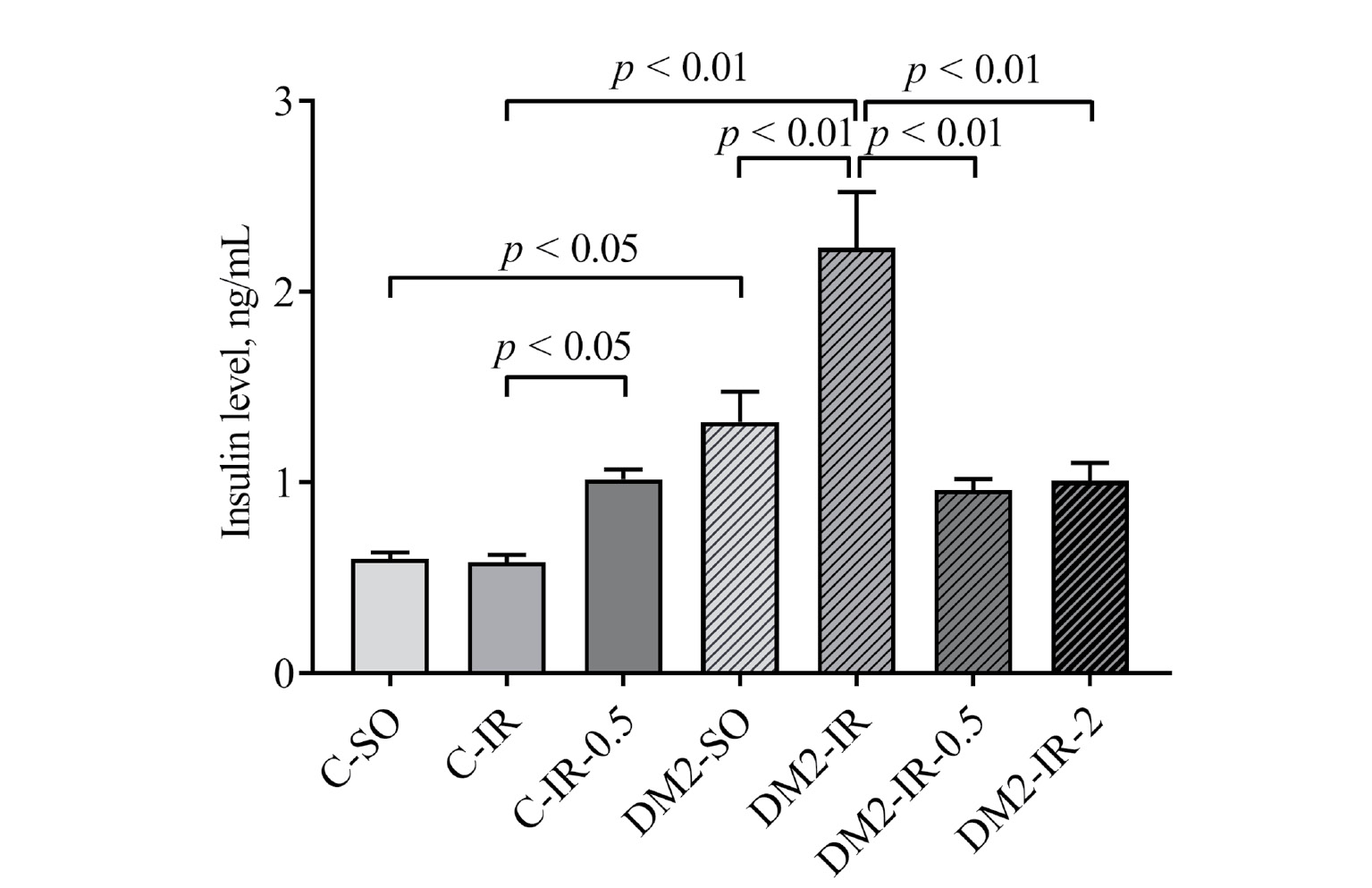 Двухсосудистая ишемия и 7-дневная реперфузия не оказывали существенного влияния на постпрандиальный уровень инсулина в контрольной группе (рис. 4). В то же время уровень инсулина повышался у крыс группы DM2-IR по сравнению с группами DM2-SO и C–IR (p < 0.01 в обоих случаях). Обработка ИВИ повышала уровень инсулина в крови крыс группы C–IR (p < 0.05). При этом в группах DM2-IR-0.5 и DM2-IR-2 отмечали значимое снижение уровня инсулина по сравнению с группой DM2-IR (p < 0.01 в обоих случаях) (рис. 4).