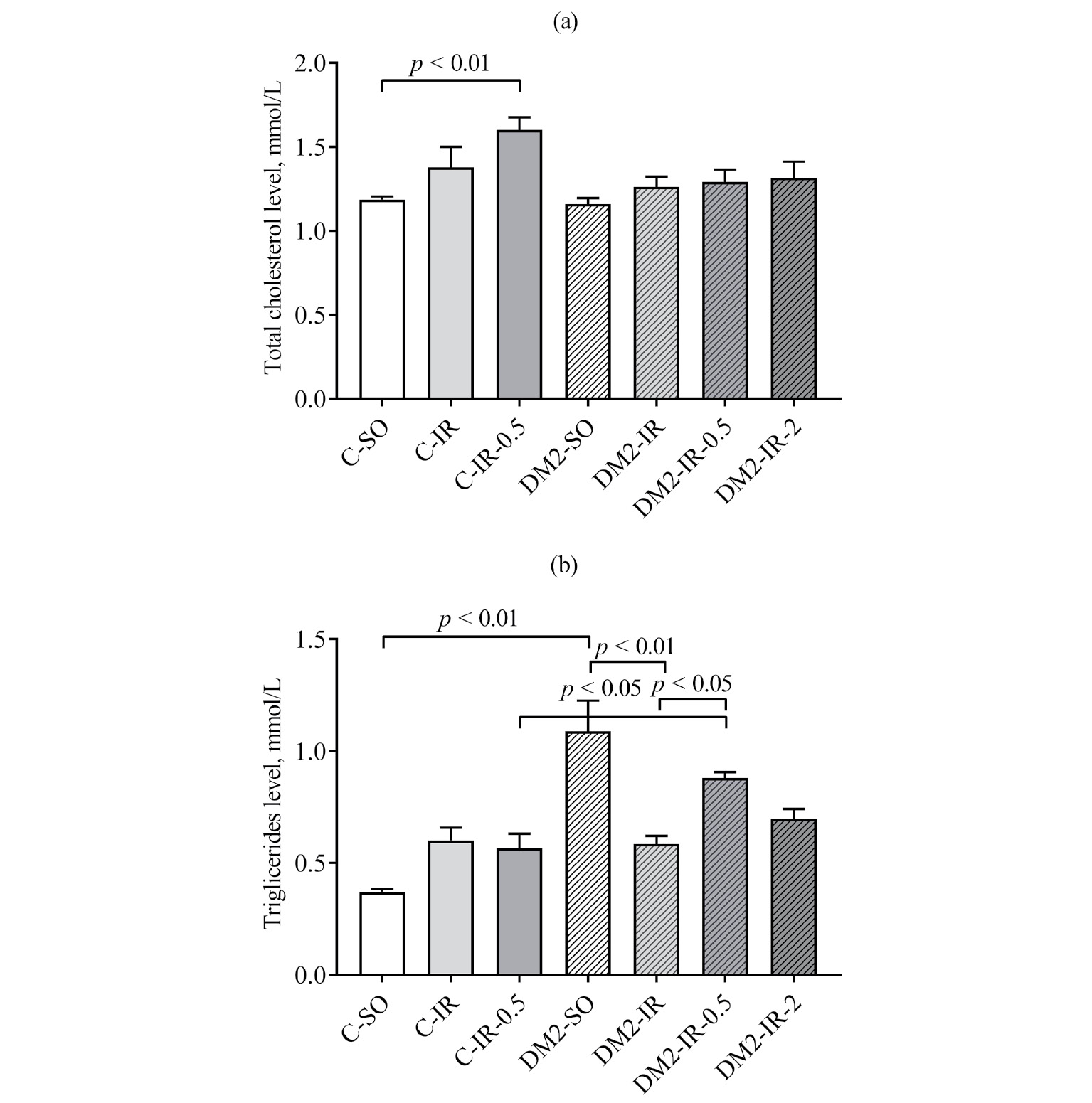 На 7-е сутки реперфузии оценивали уровни общего холестерина и триглицеридов в крови крыс. Существенных изменений уровня общего холестерина в исследуемых группах обнаружено не было, за исключением того, что введение ИВИ в дозе 0.5 МЕ/крыса/сутки крысам без СД2, перенесшим ишемию, приводило к повышению уровня холестерина по сравнению с группой C-SO (рис. 5a). Уровень триглицеридов на 7-е сутки реперфузии в крови в группе DM2-SO был выше, чем соответствующий показатель у крыс без СД2, а в группе DM2-IR показано его снижение по сравнению с группой DM2-SO (рис. 5b). При обработке СД2-крыс ИВИ в дозе 0.5 МЕ/крыса/сутки отмечено повышение содержания триглицеридов в крови по сравнению с группой DM2-IR.