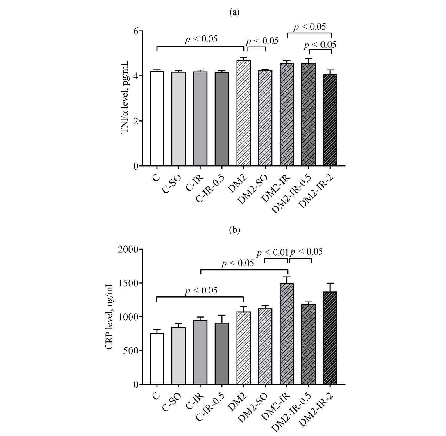 Методом ИФА было изучено содержание CRP и TNFα в крови крыс до индукции у них ИшР и через трое суток после начала реперфузии (рис. 6a, b). По нашим данным, у крыс с СД2 отмечены повышенные базовые уровни CRP и TNFα в крови по сравнению с контрольными недиабетическими крысами (p < 0.05). На 3-и сутки реперфузии показано повышение уровня CRP в крови крыс группы DM2-IR по сравнению с таковыми в группах DM2-SO и C–IR (рис. 6b) и отмечена тенденция к повышению уровня TNFα. ИВИ не оказывал выраженного влияния на уровни CRP и TNFα в крови крыс без СД2. Ежедневная обработка СД2-крыс с помощью ИВИ в дозе 0.5 МЕ/крыса/сутки снижала уровень CRP по сравнению с группой DM2-IR до его уровня у крыс группы DM2-SO. При этом изменений уровня TNFα при этой дозе обнаружено не было, тогда как введение ИВИ в дозе 2 МЕ/крыса/сутки снижало содержание TNFα на 3-и сутки реперфузии (рис. 6a).