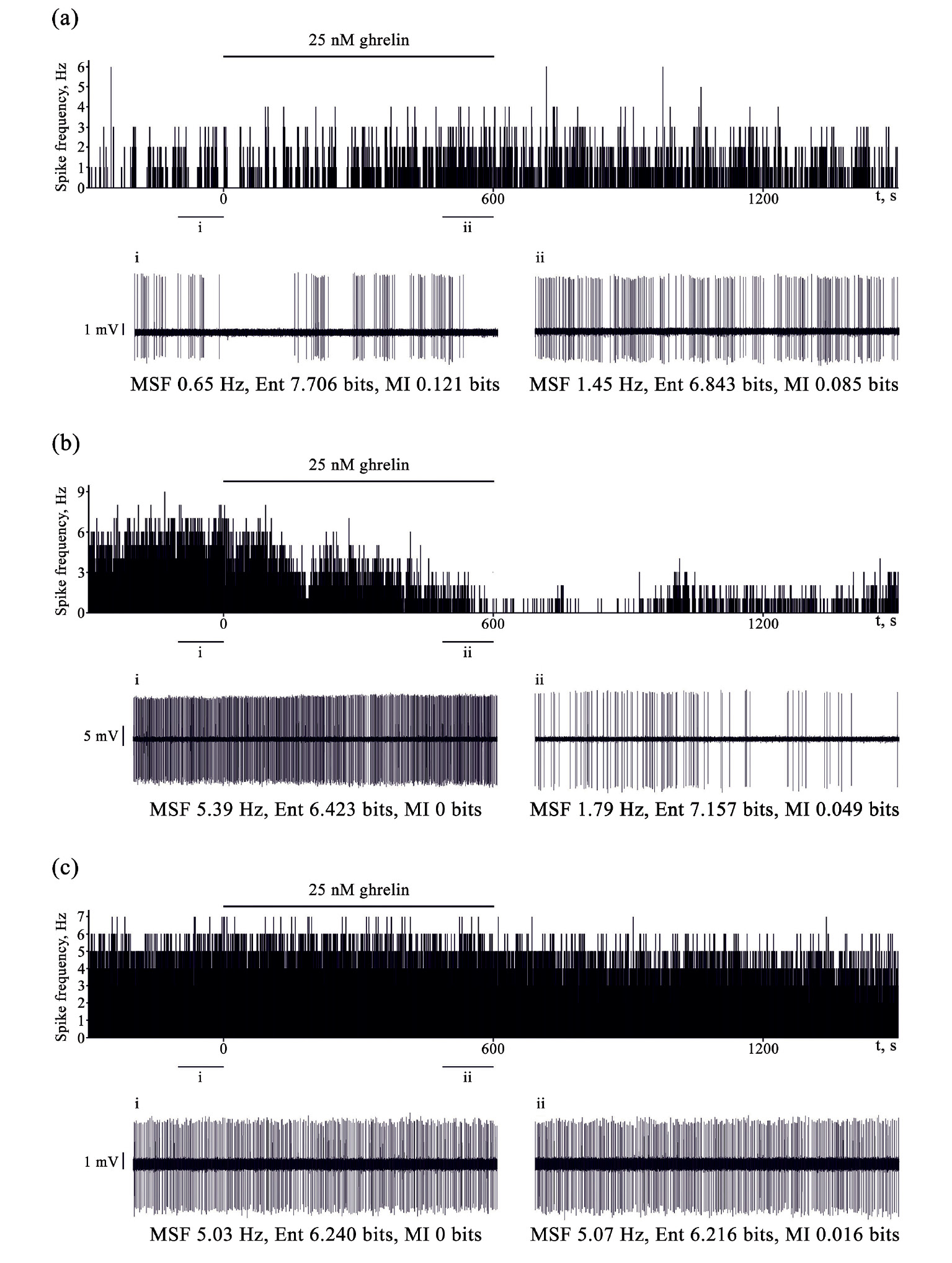 Рис. 1. Примеры реакций нейронов супрахиазматического ядра на аппликацию 25 нМ грелина в виде роста спайковой активности (a), снижения спайковой активности (b) и отсутствия существенных изменений активности (c). Для всех нейронов в верхней части рисунка представлены гистограммы с данными об изменениях уровня спайковой активности клеток по ходу эксперимента. Период аппликации грелина показан горизонтальным отрезком над гистограммой. По оси абсцисс – время в секундах (момент начала аппликации соответствует 0), по оси ординат – частота спайков (Гц). Горизонтальным отрезкам под гистограммой (i, ii) соответствуют 100-секундные интервалы записи спайковой активности нейронов, представленные под гистограммой: (i) – непосредственно перед воздействием, (ii) – в конце аппликации грелина.