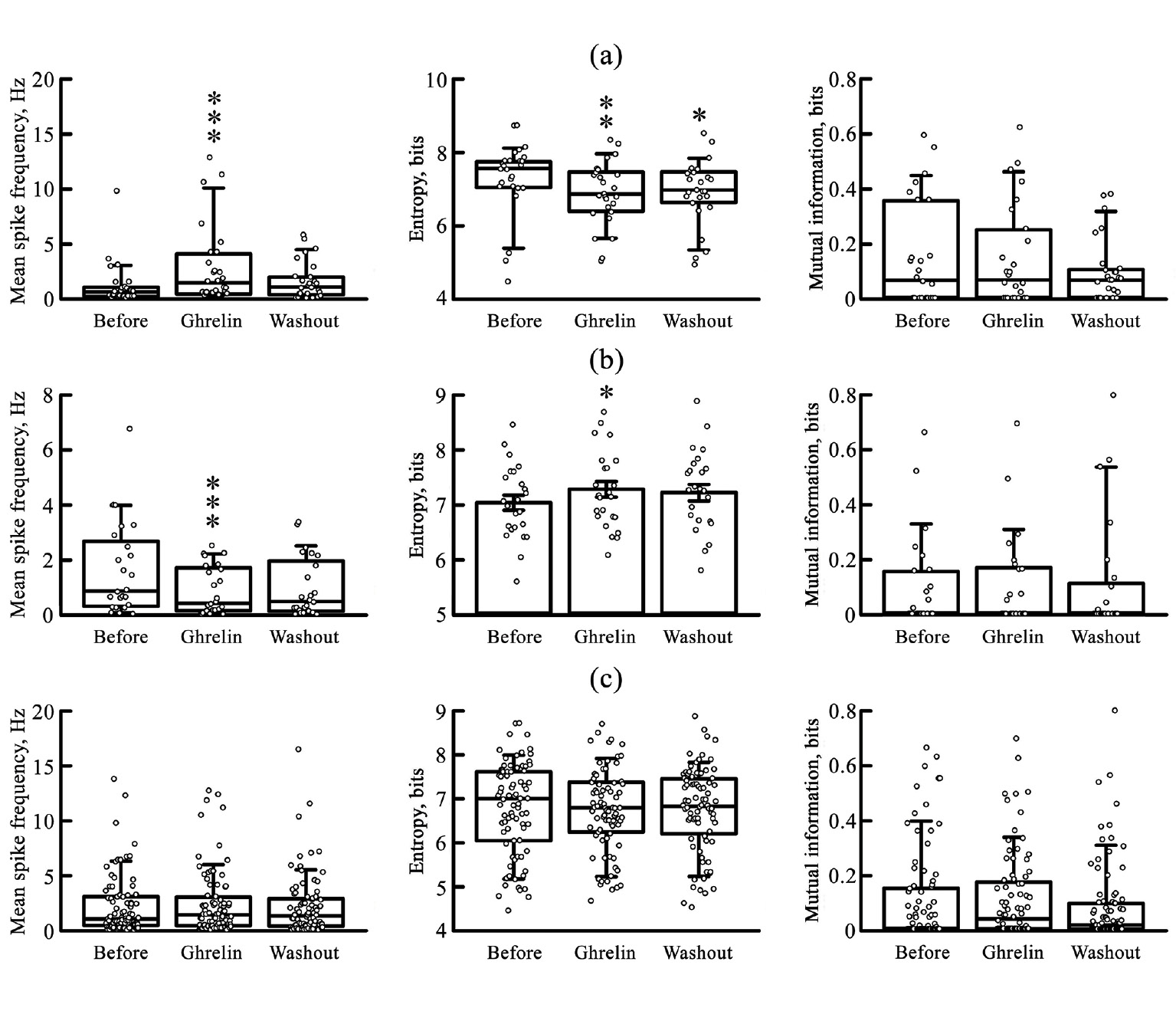 Рис. 2. Статистические данные о влиянии 25 нМ грелина на среднюю частоту потенциалов действия, Гц (левые диаграммы), энтропию распределения межспайковых интервалов, бит (средние диаграммы) и обоюдную информацию между сопряжёнными межспайковыми интервалами, бит (правые диаграммы) нейронов супрахиазматического ядра. (a) Нейроны, активность которых повышалась под влиянием грелина (n = 26). (b) Нейроны, активность которых снижалась под влиянием грелина (n = 24). (c) Вся совокупность зарегистрированных нейронов (n = 81). Обозначения под диаграммами: Before – исходное состояние; Ghrelin – на фоне действия грелина; Washout – после «отмывания» среза иЦСЖ. Звёздочками отмечены статистически значимые различия с исходным состоянием: *p < 0.05; **p < 0.01; ***p < 0.001.