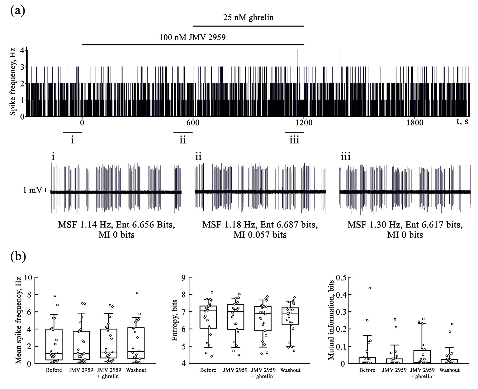 Рис. 3. Селективный антагонист GHS-R1a рецепторов JMV 2959 не оказывал влияния на спайковую активность нейронов супрахиазматического ядра, но предотвращал эффекты 25 нМ грелина. (a) Пример реакции нейрона на аппликацию антагониста и последующую аппликацию грелина. В верхней части рисунка представлена гистограмма с данными о частоте спайков нейрона по ходу эксперимента. Периоды аппликации антагониста и грелина показаны горизонтальными отрезками над гистограммой. По оси абсцисс – время в секундах (момент начала аппликации соответствует 0), по оси ординат – частота спайков (Гц). Горизонтальным отрезкам под гистограммой (i, ii, iii) соответствуют 100-секундные интервалы записи спайковой активности нейронов, представленные под гистограммой: (i) – непосредственно перед воздействием, (ii) – в конце аппликации антагониста, (iii) – в конце аппликации грелина на фоне действия антагониста. (b) Статистические данные о влиянии 100 нМ JMV 2959 и 25 нМ грелина на фоне действия антагониста на среднюю частоту потенциалов действия, Гц (левая диаграмма), энтропию распределения межспайковых интервалов, бит (средняя диаграмма) и обоюдную информацию между сопряжёнными межспайковыми интервалами, бит (правая диаграмма) нейронов (n = 22). Обозначения под диаграммами: Before – исходное состояние; JMV 2959 – на фоне действия антагониста; JMV 2959 + Ghrelin – на фоне совместного действия антагониста и грелина; Washout – после «отмывания» среза иЦСЖ.