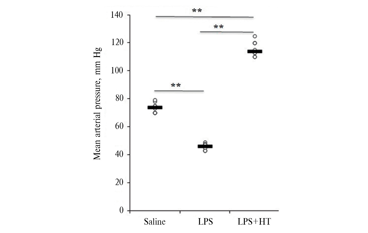 Кроме того, известно, что гиперпродукция оксида азота (NO) в результате активации синтаз оксида азота (NOS) играет ключевую роль в развитии острой гипотонии, характерной для септических состояний различного происхождения [32]. В работах последних лет было продемонстрировано, что периодическая гипоксия препятствует массивной продукции NO в результате образования депо NO, что, в свою очередь, уменьшает вазодилатацию, эффективно способствует вазоконстрикции, тем самым предотвращая гипотонию и риски необратимых последствий [33]. Наши результаты хорошо согласуются с приведенными данными, поскольку у крыс с ЛПС-индуцированной эндотоксемией предварительная кратковременная ГТ устраняла гипотонию при последующем тестировании тяжелой гипоксией.