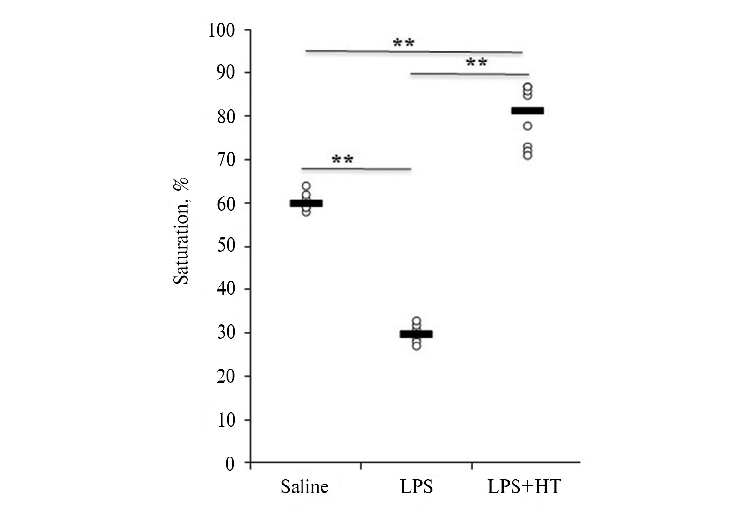 Рис. 2. Сатурация у крыс с ЛПС-индуцированной эндотоксемией в точке гипоксического апноэ до и после гипоксической тренировки. ** p < 0.01.