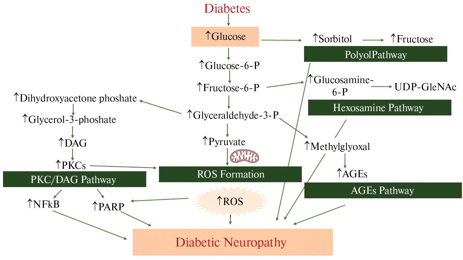 Методом магнитно-резонансной томографии показано, что длительная гипергликемия приводит к структурным изменениям в головном мозге. Нарушение работы нервной системы у пациентов с СД связано с развитием макро- и микроангиопатии, очагов нейродегенерации из-за ишемических эпизодов и резких колебаний уровня глюкозы [25]. В конечном счете в нейронах накапливаются метаболические изменения: усиливается митохондриальная дисфункция и развивается окислительный стресс, сопряженный с усиленным образованием свободных радикалов и снижением возможности их нейтрализации [25, 26] и запуску воспалительного ответа [27–29]. Запуск основных метаболических путей, активирующихся при гипергликемии: полиолового, диацилглицеролового, гексозаминового, активация митоген-активируемой протеинкиназы (MAPK) и NF-κВ, а также образование АФК – приводят к активации гибели нейронов и нейровоспалению [2, 4].