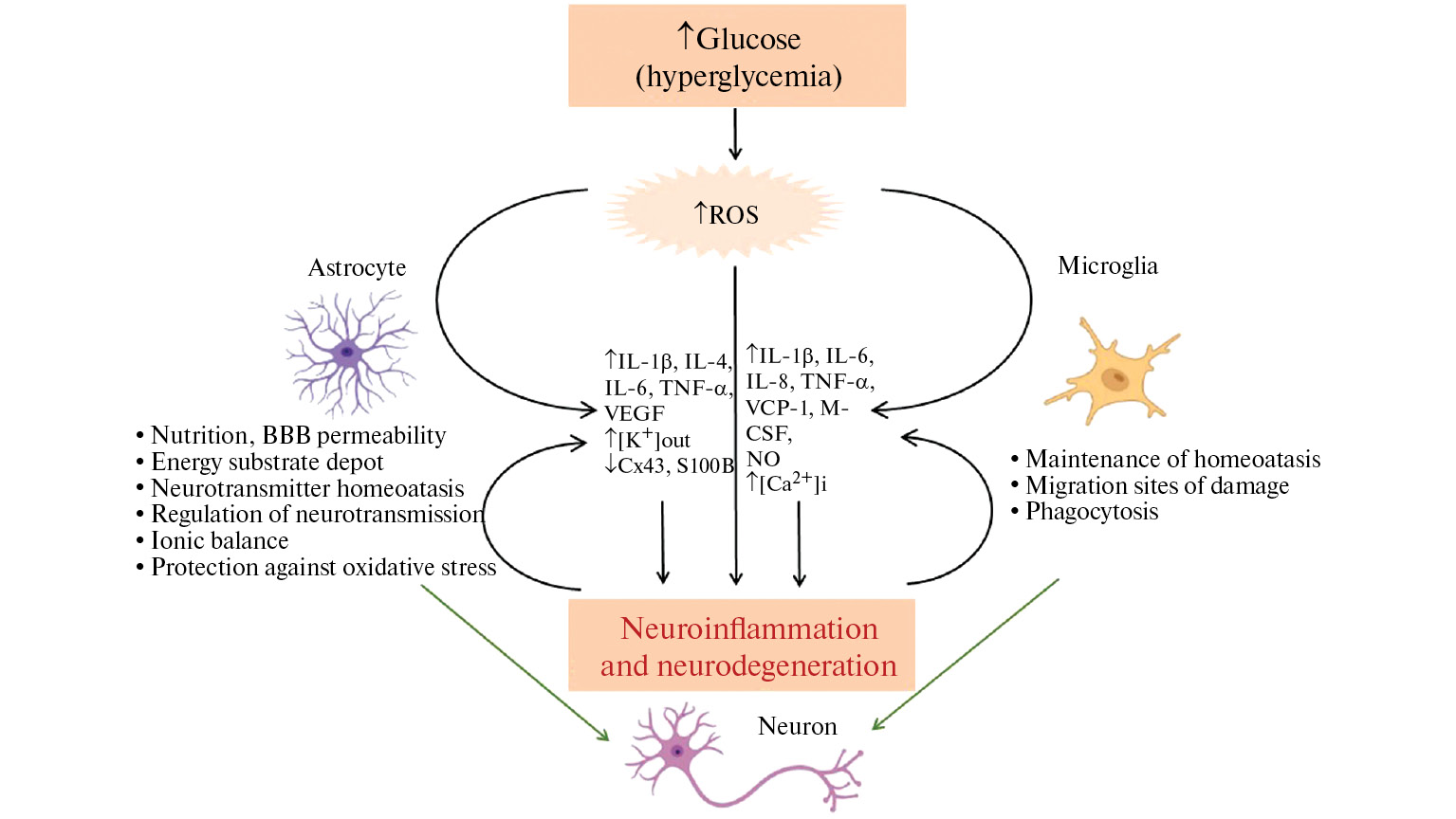 Устойчивые эпизоды гипергликемии приводят к нарушению деятельности нейронов, вызывая их гибель. В то же время нейроглия реагирует на повышенный уровень глюкозы преимущественно по провоспалительному типу, запуская высвобождение цитокинов, которые в свою очередь оказывают токсический эффект на нейроны и способствуют дальнейшей активации глии. Астроциты как клетки, принимающие непосредственное участие в функционировании нейронов, являются основными посредниками негативного влияния гипергликемии на нейроны. Микроглия, вероятно, отвечает при СД за распространение нейровоспаления в мозговой ткани, потенцируя негативное действие гипергликемии системно на все структуры и клетки головного мозга.