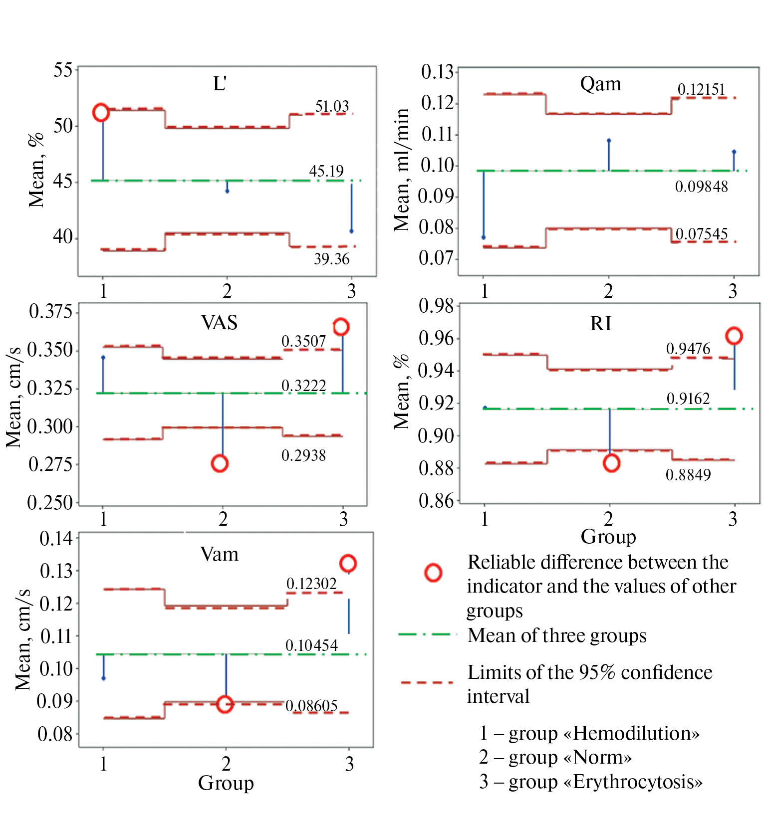 Автоматический пошаговый расчет дискриминантной функции в виде линейной комбинации всех характеристик кровотока в каждой группе позволил выявить наиболее значимые характеристики кровотока в МЦР, которые изменяются в зависимости от измененного состава крови. К ним относятся: средняя систолическая скорость Vas (F=6.72, р < 0.01), средняя скорость Vam (F=16, р < 0.001), средняя объемная скорость Qam (F=7.39, р < 0.001), индекс сопротивления сосудов RI (F=7.07, р < 0.01) и процентное содержание клеток крови, движущихся в диапазоне низкой скорости L' (F=3.7, р = 0.03).