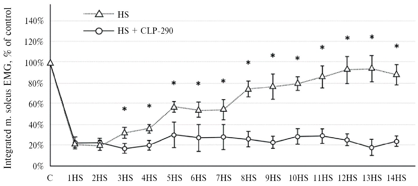 Рис. 1. Динамика интегральной ЭМГ-активности камбаловидной мышцы на фоне 14-суточного антиортостатического вывешивания с введением и без введения CLP290. * статистически значимое между группами с введением и без введения препарата (p < 0.05).