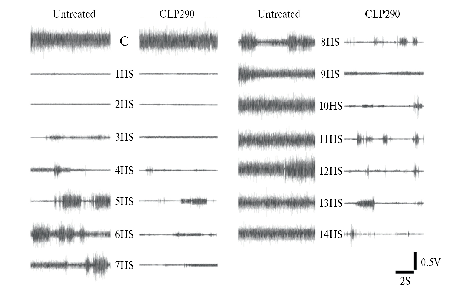 Рис. 2. Типичные паттерны ЭМГ-активности камбаловидной мышцы перед антиортостатическим вывешиванием (С) и во время 14-дневного вывешивания (1–14HS) у крыс без введения и с введением CLP290.