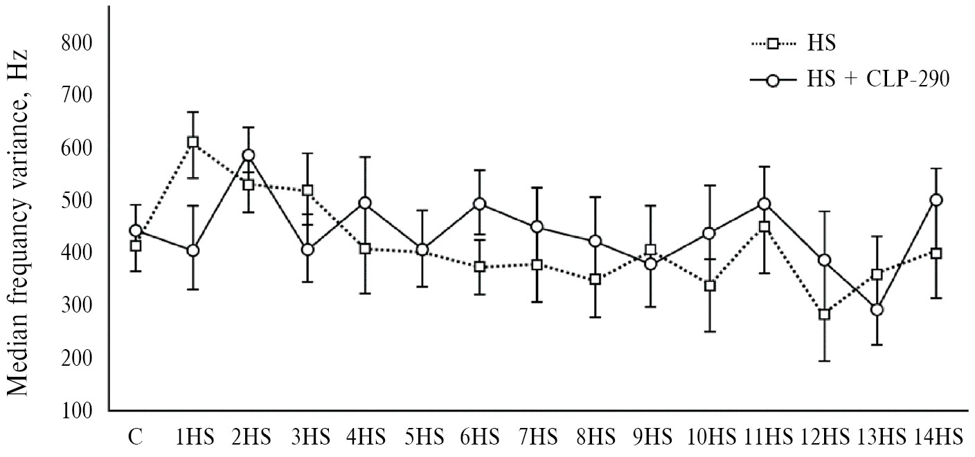 Влияние CLP290 на динамику электрической активности камбаловидной мышцы при антиортостатическом вывешивании. Интегральная ЭМГ-активность камбаловидной мышцы в первые сутки антиортостатического вывешивания снизилась до 20% от контрольных значений. Начиная с третьих суток вывешивания, наблюдалось статистически значимое отличие в уровне интегральной ЭМГ-активности между группами с введением и без введения CLP290. В группе «чистого» вывешивания интегральная ЭМГ-активность нарастала, к 12-м суткам достигая 90% от уровня контроля. В группе с внутрибрюшинным введением CLP290 уровень интегральной ЭМГ-активности за все время антиортостатического вывешивания не превысил 30% от уровня контроля (рис. 1, 2). Анализ ЭМГ-сигнала камбаловидной мышцы также показал, что средние значения величины медианной частоты (рис. 3) существенно не отличались между группами с введением и без введения CLP290 в течение всего периода антиортостатического вывешивания.