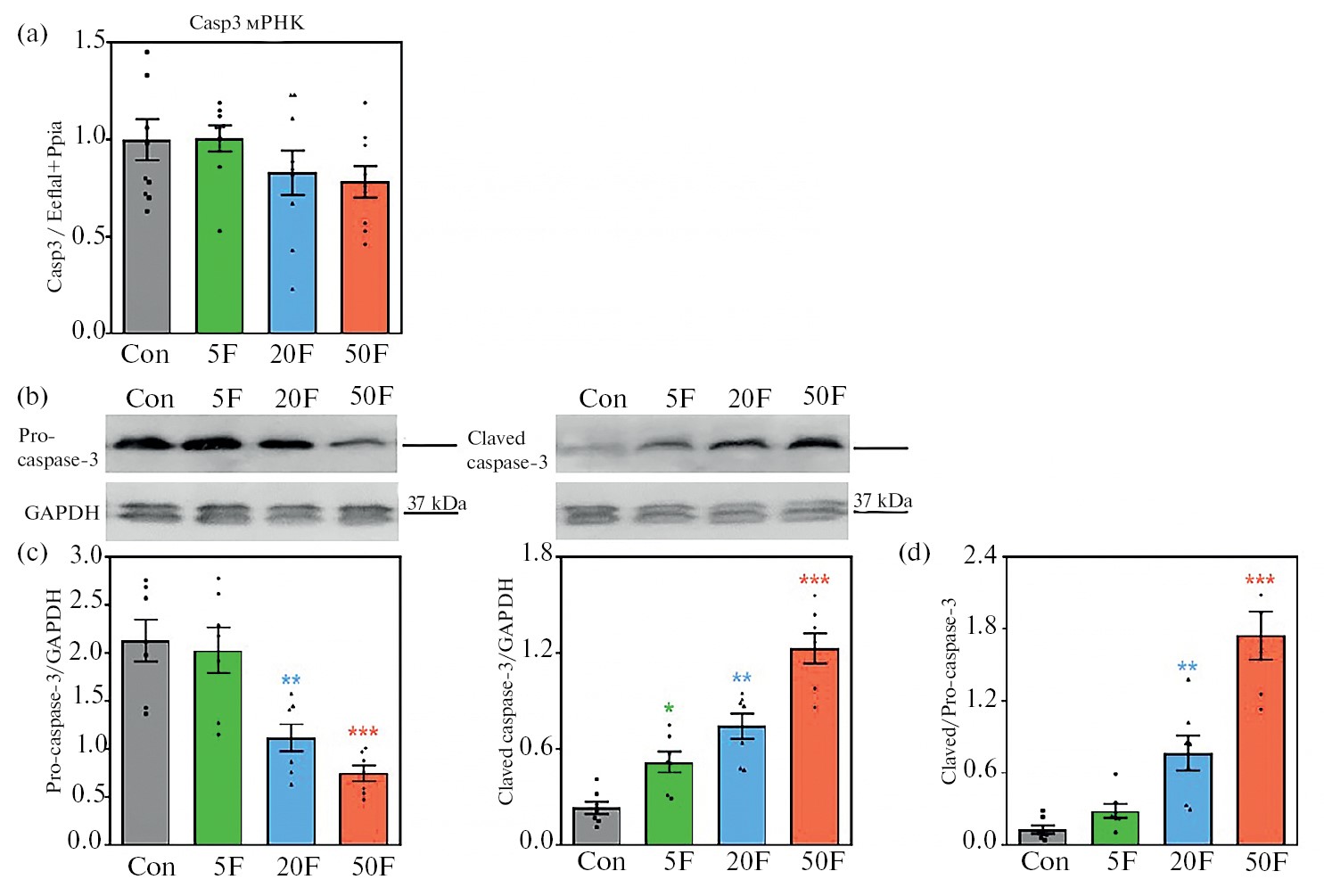 Экспрессия гена Casp-3, кодирующего один из ключевых посредников апоптоза – каспазу-3, была сравнима в клетках гиппокампа крыс из всех экспериментальных групп (рис. 3a). Однако содержание этой эффекторной молекулы изменялось на уровне белка. В гиппокампе контрольных животных практически весь клеточный пул каспазы-3 был представлен ее протеолитически неактивной проформой с молекулярной массой 32 kDa, однако у крыс, получавших 20 и 50 мг/л F-, уровень этой нативной формы достоверно снижался (рис. 3b, c). В противоположность этому в клетках гиппокампа крыс из контрольной группы определялись лишь небольшие количества активной каспазы-3 с молекулярной массой 17 kDa, но воздействие 5, 20 и 50 мг/л F- привело к значительному увеличению ее содержания. Такие изменения уровней экспрессии прокаспазы-3 и активной каспазы В привели к смещению соотношения в сторону последней (рис. 3d) и подтверждают стимуляцию процессов апоптоза.