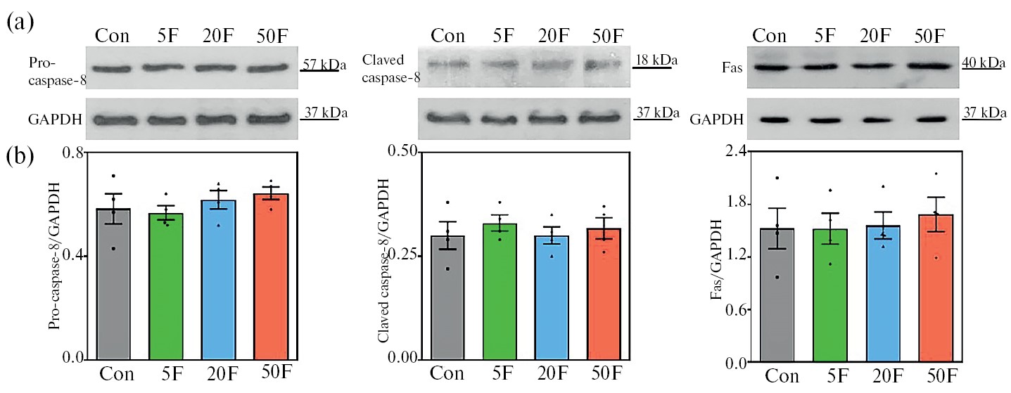 Рис. 4. Экспрессия на уровне белка двух форм каспазы-8 и рецепторов Fas в клетках гиппокампа крыс после длительного воздействия F-. (a) – Пример иммуноблотов для одного животного из каждой группы. (b) – Среднее содержание белков каспазы-8 и Fas ± SE в клетках, рассчитанное по отношению к содержанию референсного белка GAPDH (n = 4).