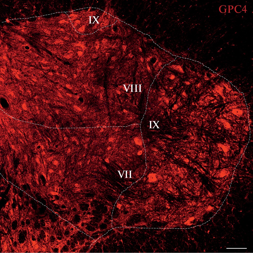Рис. 1. Иммунофлуоресцентный анализ. Визуализация экспрессии GPC4 в различных пластинках (VII, VIII, IX) передних рогов в поясничном отделе (сегменты L3–4) спинного мозга крысы. Масштаб: 100 мкм (10×).
