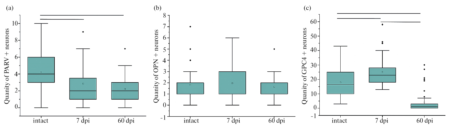 Рис. 2. Количество (a) PARV+, (b) OPN+, (c) GPC4+ нейронов в VII пластинке передних рогов в поясничном отделе (сегменты L3–4) интактного (intact) и травмированного на уровне грудного отдела (сегмент Тh8) спинного мозга крысы на 7-е и 60-е сутки после повреждения (7 и 60 dpi – days poist injury); p < 0.05, тест Крускала – Уоллиса.