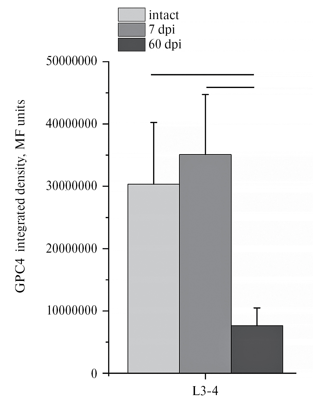 Интегральная интенсивность флуоресценции GPC4 в передних рогах спинного мозга в сегментах L3–4 демонстрирует тенденцию к некоторому увеличению на 7-е сутки и значительно снижается к 60-м суткам (в 3.9 и в 4.6 раз по сравнению с интактным контролем и показателем на 7-е сутки соответственно, p < 0.05) (рис. 5).