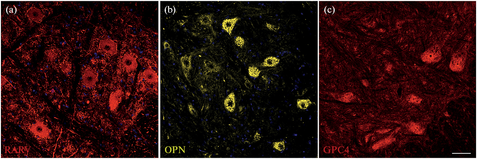 Рис. 6. Иммунофлуоресцентный анализ. Визуализация экспрессии (a) PARV (красным), (b) OPN (желтым) и (c) GPC4 (красным) в передних рогах (пластинка IX) поясничного отдела (сегменты L3–4) спинного мозга крысы. Масштаб: 50 мкм (20×).