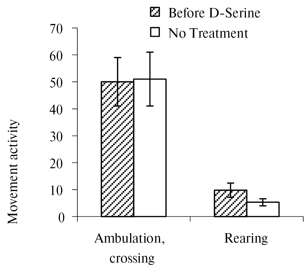 Рис. 2. Горизонтальная двигательная активность, пересечения (Ambulation, crossing) и число стоек (Rearing) в тесте «Открытое поле» у крыс до введения D-серина в мПК (Before D-Serine) и у животных без введения D-серина (No Treatment). Достоверных отличий не найдено, t-критерий Стьюдента.