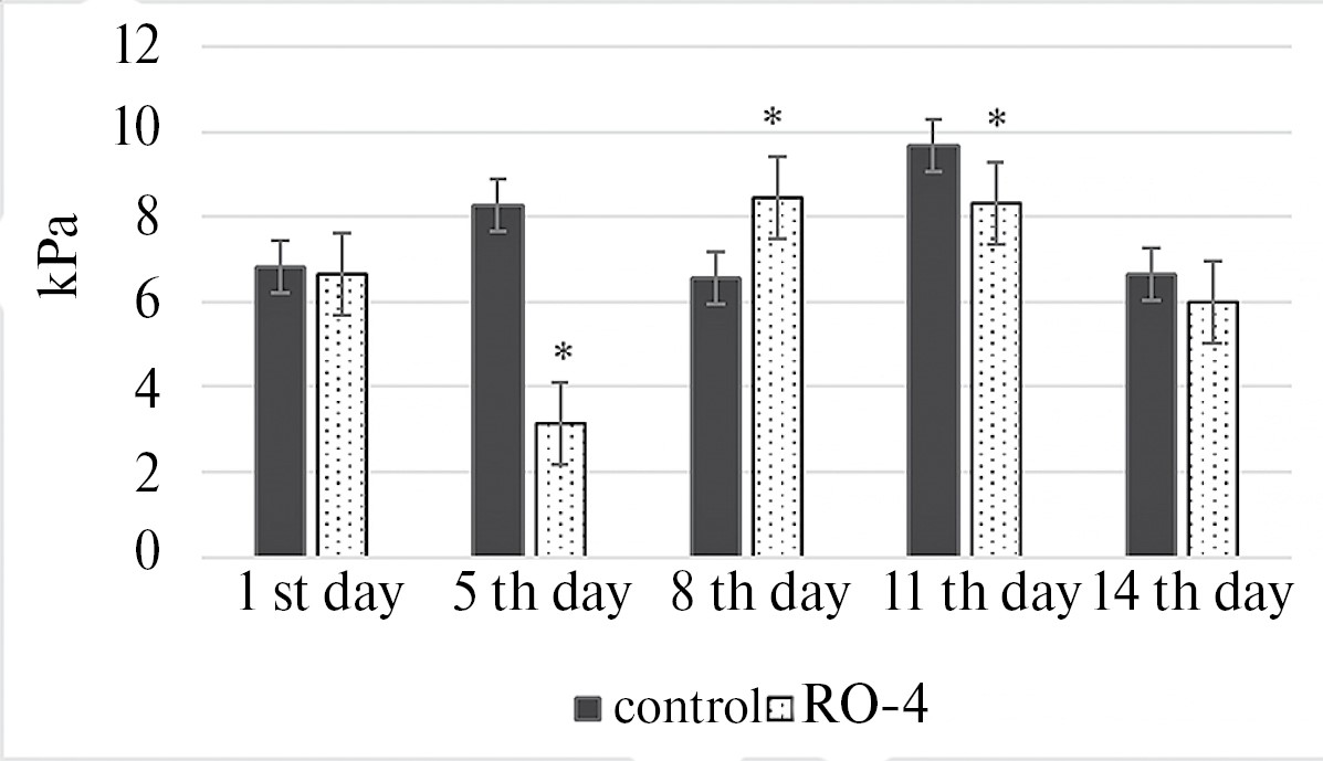 Результаты экспериментальных данных обработаны с использованием пакета описательной статистики Excel 10.0. В исследовании выполнена проверка гипотезы о нормальном распределении. Данные модуля Юнга приведены в виде средних значений со стандартной ошибкой, полученные результаты подвергаются нормальному распределению, в связи с чем для оценки достоверности использовали критерий Стьюдента при р < 0.05.
