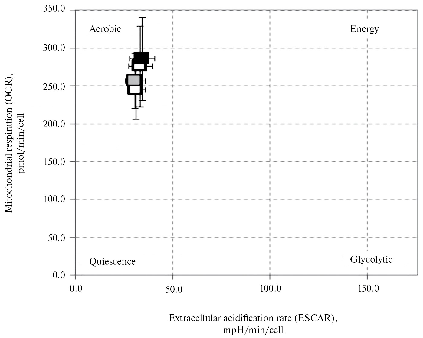 Рис. 3. Метаболическая карта энергетического фенотипа первичной смешанной культуры нейронов: обозначены области дыхания Aerobic – аэробное дыхание; Quiescence – дыхательный покой; Energy – клеточный метаболизм, основанный на смешанном дыхании (окислительное фосфорилирование и гликолиз); Glycolytic – анаэробное дыхание. Серым цветом указана контрольная группа, черным – опытная группа (блокатор Ro-4). Закрашенные квадратики обозначают дыхание до блокады цепи переноса электронов, незакрашенные квадратики означают дыхание после блокады цепи переноса электронов стрессорами.