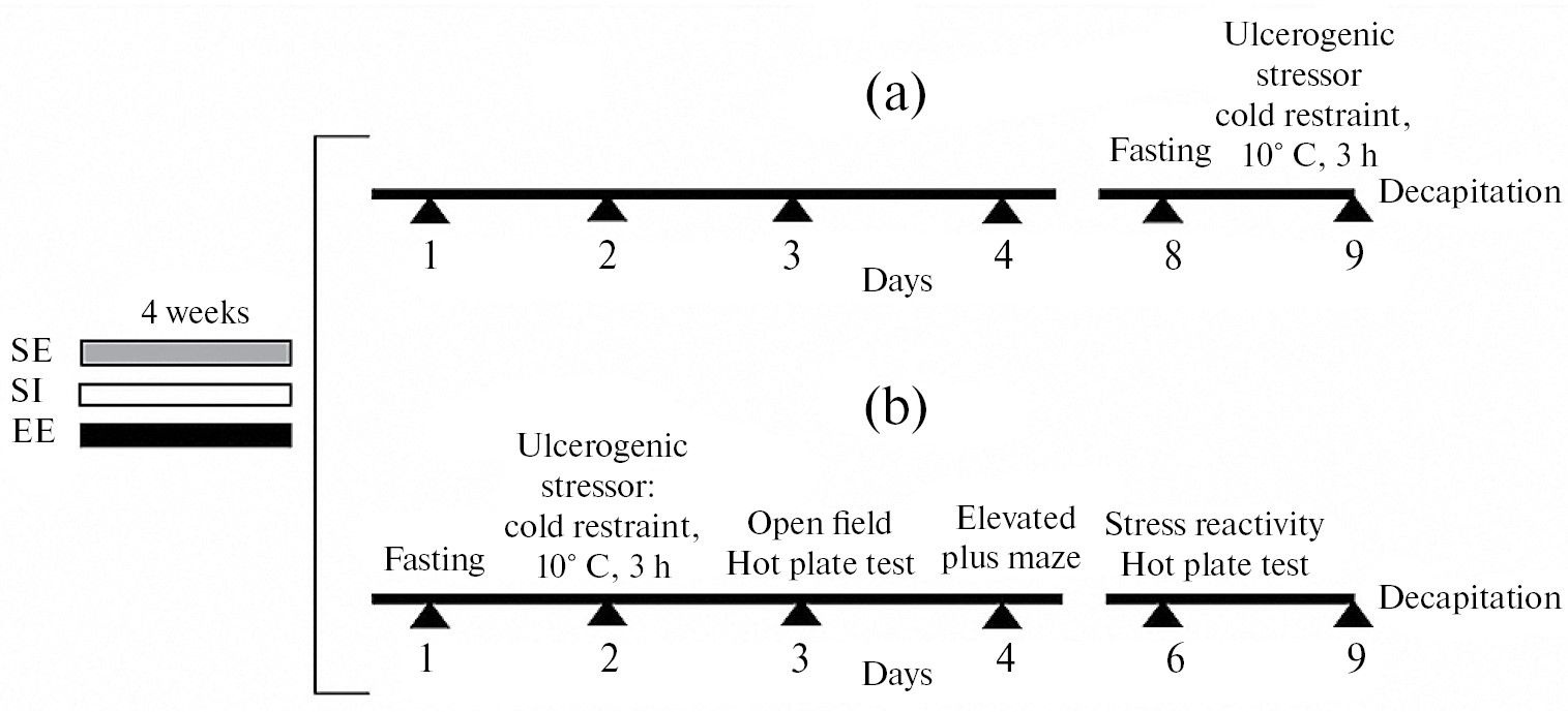 Рис. 1. Экспериментальная схема. Крысята 30-дневного возраста помещались на 4 недели в разные условия содержания: стандартные условия (СУ), социальную изоляцию (СИ) или обогащенную среду (ОС). Затем они были разделены на две группы, каждая из которых подвергалась действию ульцерогенного стрессора (УС): 3 ч иммобилизация при холоде (10 °С). В первой группе (а) исследовали влияние условий содержания только на чувствительность слизистой оболочки желудка к действию УС (эксперимент 1), во второй группе (b) изучали влияние условий содержания на поведение, стресс-реактивность ГГАКС и соматическую болевую чувствительность после действия УС (эксперимент 2).