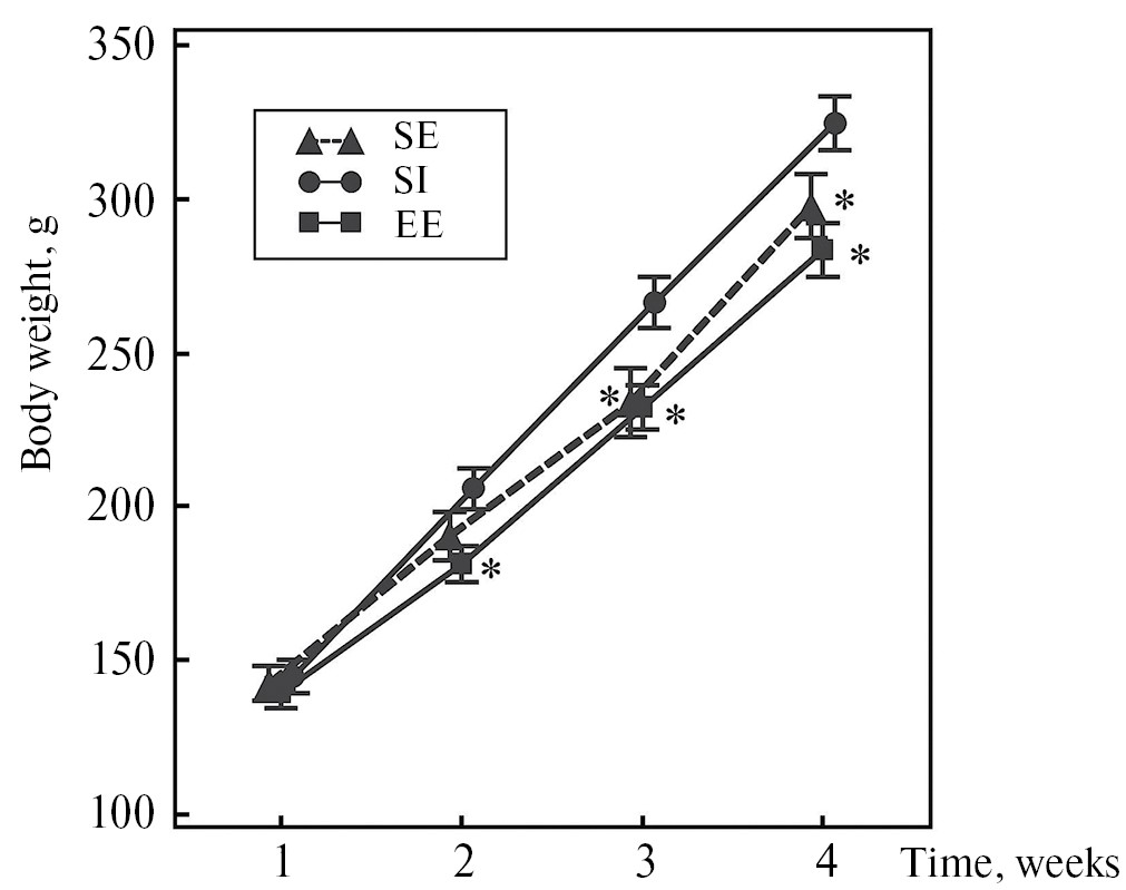 Выявленное влияние СИ на повышение массы тела у крыс с увеличением их возраста хорошо согласуется с данными литературы [26–28]. Одной из причин такого последствия СИ может являться увеличенное потребление пищи вследствие нарушения пищевого поведения [26, 27].