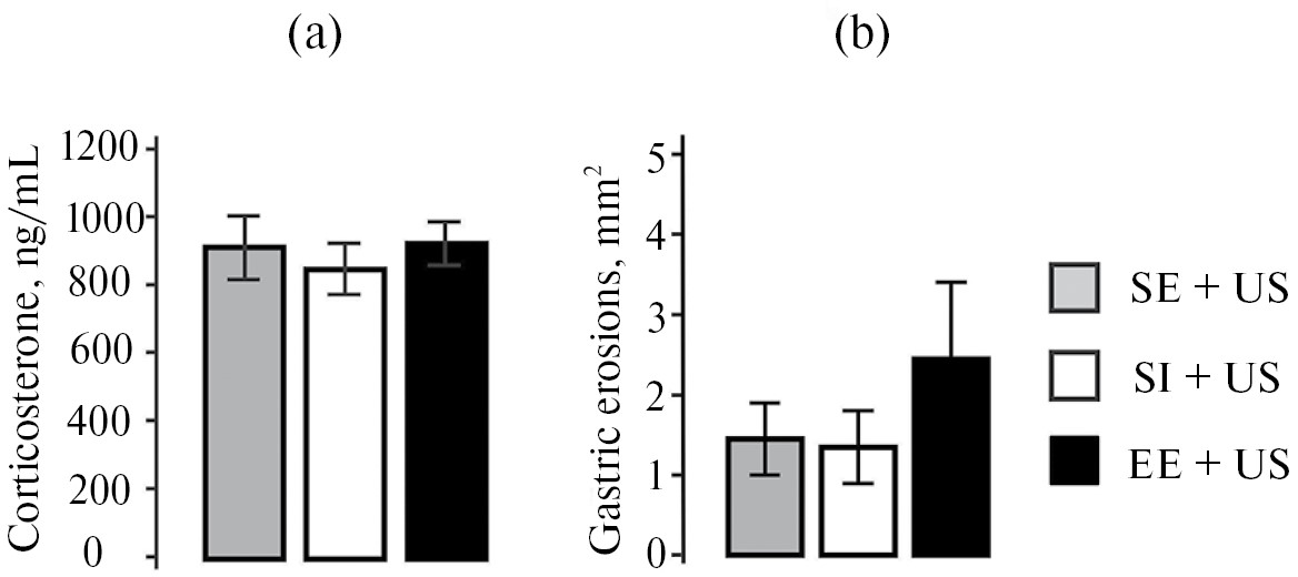 После действия ульцерогенного стрессора (3 ч иммобилизация, 10 ˚С) не было обнаружено достоверных отличий между средними уровнями кортикостерона у крыс, содержащихся в СУ, ОС и СИ (рис. 3а). Трехчасовая иммобилизация при температуре 10 °С на фоне 24 ч голода приводила к появлению эрозивных повреждений в слизистой оболочке желудка крыс всех групп. Достоверных отличий (p = 0.86) в средней площади эрозивных повреждений желудка между группами также не было выявлено (рис. 3b).