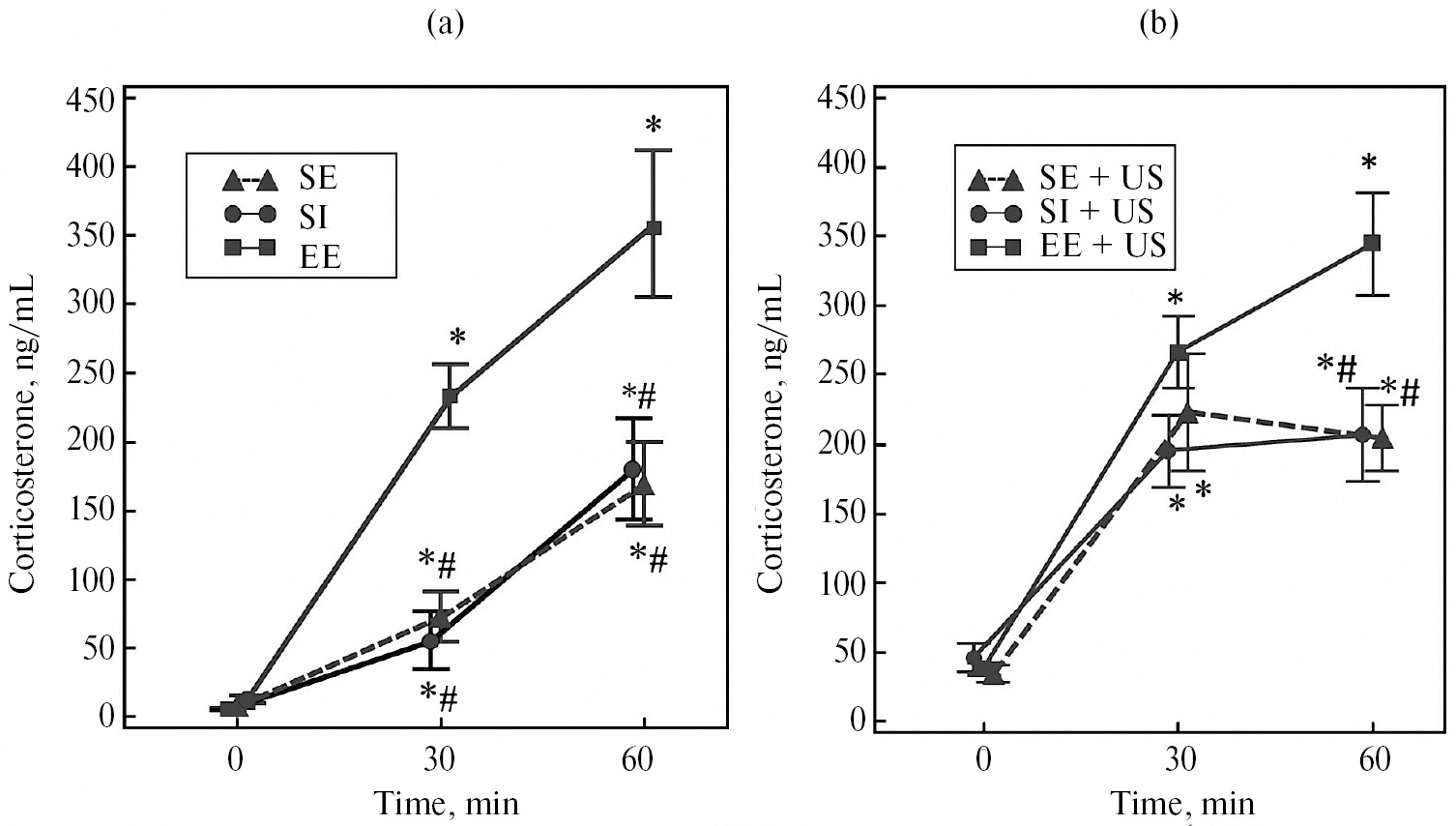 Рис. 4. Влияние условий содержания крыс на стресс-реактивность ГГАКС без ульцерогенного стрессора (а) и в условиях его действия (3 ч иммобилизация, 10 ˚С) (b). Достоверность отличий при p < 0.05: * от базального уровня (0 точка); # от группы ОС (обогащенная среда). СИ – изоляция, СУ – стандартные условия. Количество случаев в группе n = 6.