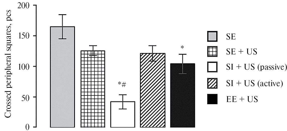 Воздействие УС само по себе не оказало влияния на поведенческие показатели в «открытом поле» животных, содержавшихся в СУ (рис. 5). У крыс пассивной подгруппы СИ с последующим воздействием УС наблюдалось более чем трехкратное снижение двигательной активности, прежде всего горизонтальной (рис. 5). Их двигательная активность была значимо снижена по сравнению с таковой у животных других экспериментальных групп, в том числе содержавшихся в СУ или ОС (рис. 5). Достоверное, но менее выраженное снижение двигательной активности после действия УС наблюдалось также в группе крыс, содержавшихся в ОС (рис. 5).