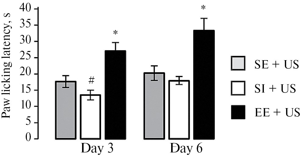 Соматическую болевую чувствительность оценивали на основании латентного периода (ЛП) реакции облизывания лап в тесте «горячей пластины» (ООО «Алгоритм», Россия) при температуре 52 ˚С. Соматическую болевую чувствительность тестировали дважды: на 2-й (день 3) и 5-й день после действия УС (день 6). Между первым и вторым тестированием соматической болевой чувствительности осуществлялось тестирование поведения и стресс-реактивности ГГАКС. Интервал между тестированием соматической болевой чувствительности и предшествующим тестированием поведения или стресс-реактивности ГГАКС составлял не менее 3 ч. Тестирование ЛП болевой реакции проводилось в одно и то же время суток.