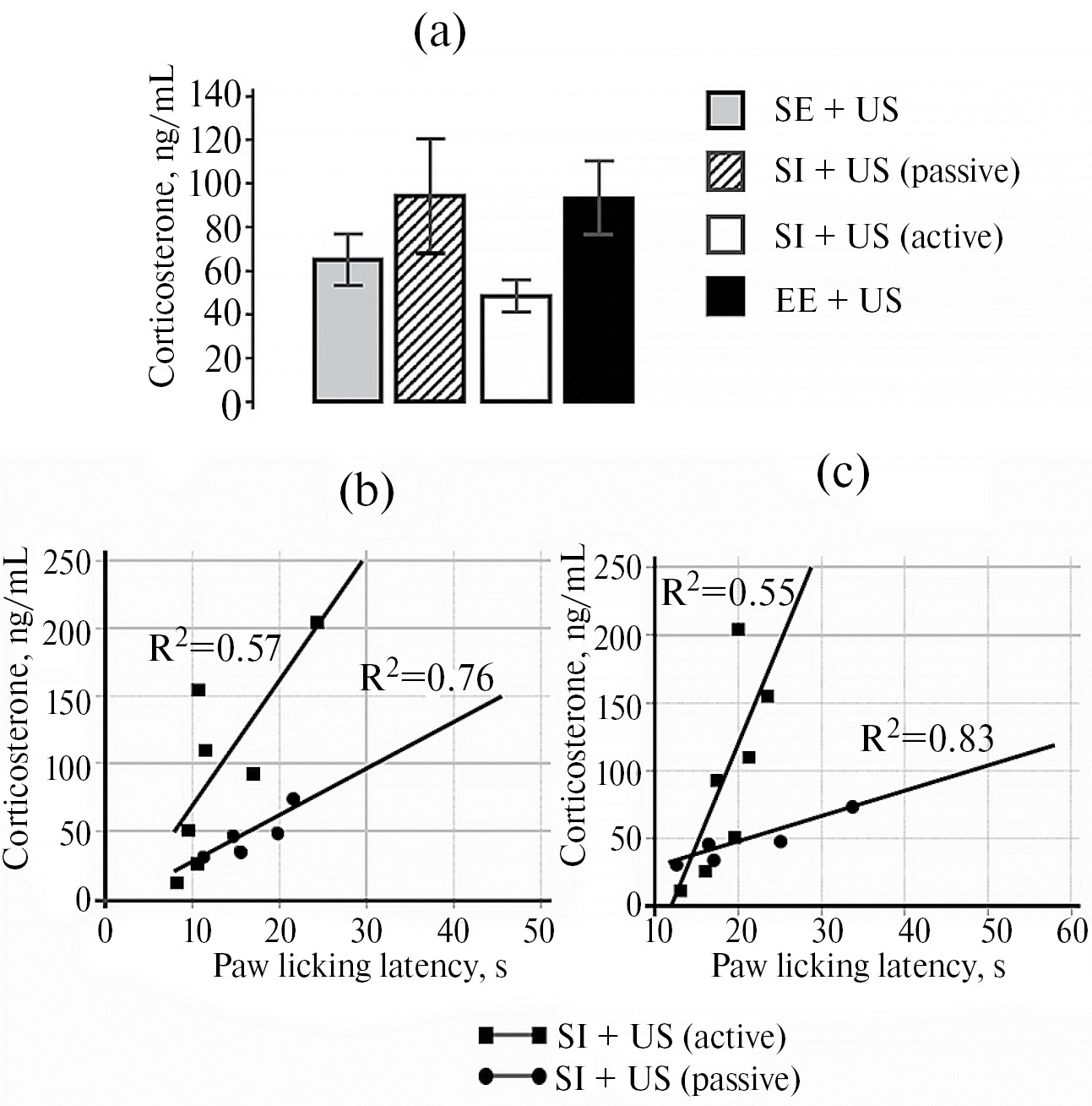 Была обнаружена корреляционная зависимость между уровнем кортикостерона и ЛП реакции облизывания лап, измеренными у одних и тех же крыс как с пассивной, так и активной стратегией поведения, находящихся в условиях CИ. Коэффициенты корреляции для «активных» и «пассивных» крыс в группе СИ при первом тестировании соматической болевой чувствительности после действия УС (день 3) составляли 0.75 (р = 0.058) и 0.87 (р < 0.05) соответственно; а при втором тестировании (день 6) – 0.74 (р < 0.05) и 0.94 (р < 0.02) соответственно. Таким образом, меньшему ЛП и, следовательно, большей чувствительности к термическому болевому стимулу соответствовал более низкий уровень кортикостерона в крови (рис. 8b и c).