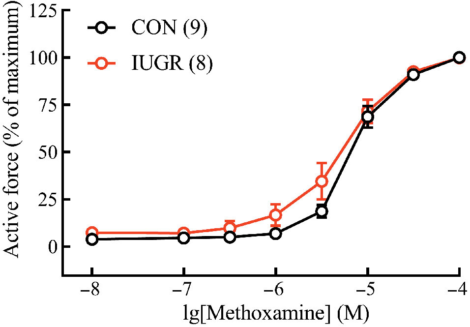 Рис. 1. Задержка внутриутробного развития (ЗВУР) не приводит к изменению реактивности подкожной артерии 11–12-дневного потомства на агонист α1-адренорецепторов метоксамин. Приведены первые зависимости «концентрация – эффект» на метоксамин артерий крысят в возрасте 11–12 дней в группах «Контроль» (CON) и «ЗВУР» (IUGR). Цифры в скобках обозначают количество животных.