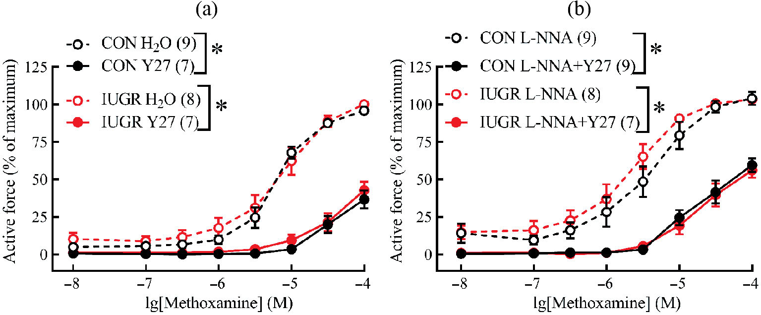 Рис. 3. Задержка внутриутробного развития (ЗВУР) не приводит к изменению проконстрикторного вклада Rho-киназы в подкожной артерии потомства в возрасте 11–12-дней. (a) – Вторые зависимости «концентрация – эффект» на метоксамин подкожной артерии крысят групп «Контроль» (CON) и «ЗВУР» (IUGR), полученные в присутствии ингибитора Rho-киназы Y27632 (3 мкМ) или эквивалентного объема растворителя (H2O). (b) – Вторые зависимости «концентрация – эффект» на метоксамин подкожной артерии крысят групп «Контроль» (CON) и «ЗВУР» (IUGR), полученные в присутствии ингибитора NO-синтаз L-NNA (100 мкМ) или L-NNA совместно с Y27632. Цифры в скобках обозначают количество животных. * p < 0.05 (двухфакторный дисперсионный анализ для повторных измерений).