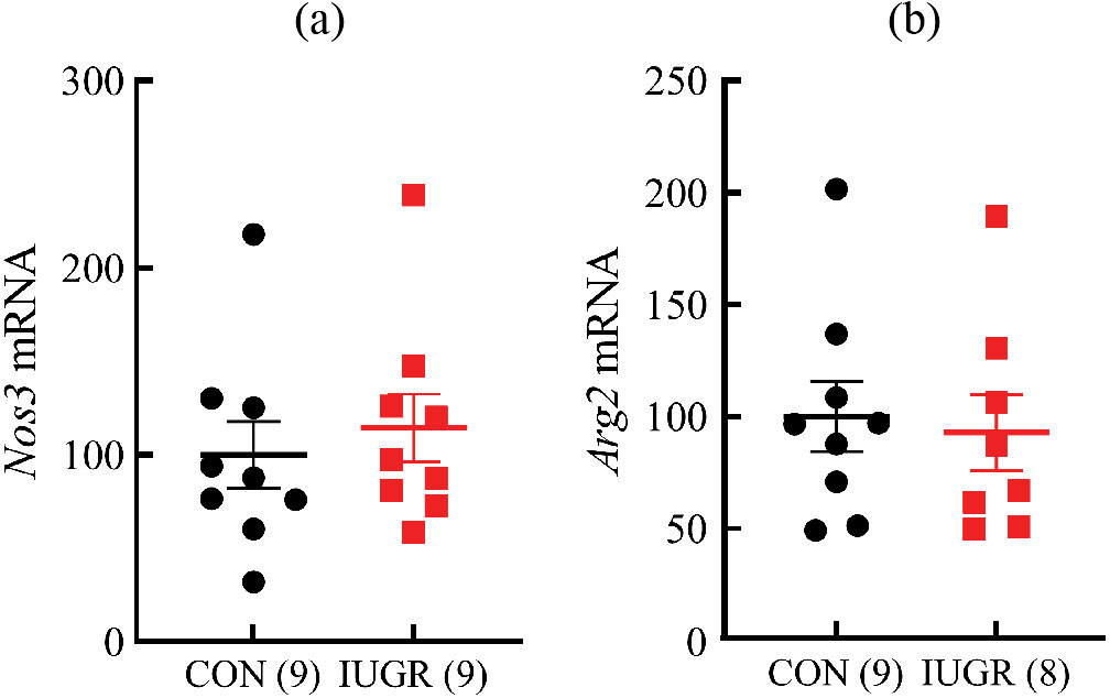 Рис. 4. Задержка внутриутробного развития (ЗВУР) не влияет на экспрессию мРНК Nos3 (eNOS) и Arg2 (аргиназа-2) в подкожной артерии потомства в возрасте 11–12 дней. Относительный уровень экспрессии мРНК Nos3 (a) и Arg2 (b) в подкожной артерии крысят групп «Контроль» (CON) и «ЗВУР» (IUGR). Значения экспрессии нормированы на геометрическое среднее экспрессии трех референсных генов (Gapdh, Rplp0, Rn18s) и выражены в процентах от среднего значения в группе «Контроль». Цифры в скобках обозначают количество животных. Данные представлены в виде среднего и стандартной ошибки среднего.